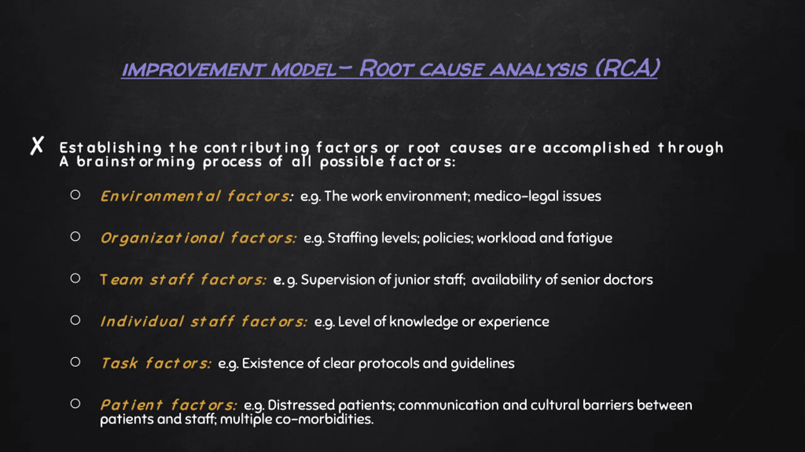 improvement improvement model model- - Root Root cause cause analysis analysis (RCA) (RCA) Est ablishing t he cont r ibut ing f act or s or r oot causes ar e accomplished t hr ough Est ablishing t he cont r ibut ing f act or s or r oot causes ar e accomplished t hr ough A br ainst or ming pr ocess of all possible f act or s: A br ainst or ming pr ocess of all possible f act or s: Envir onment al f act or s Envir onment al f act or s: : e.g. The work environment; medico-legal issues Or ganizat ional f act or s: Or ganizat ional f act or s: e.g. Staffing levels; policies; workload and fatigue T Team st af f f act or s: eam st af f f act or s: e. e.g. Supervision of junior staff; availability of senior doctors Individual st af f f act or s: Individual st af f f act or s: e.g. Level of knowledge or experience Task f act or s: Task f act or s: e.g. Existence of clear protocols and guidelines Pat ient f act or s: Pat ient f act or s: e.g. Distressed patients; communication and cultural barriers between patients and staff; multiple co-morbidities.