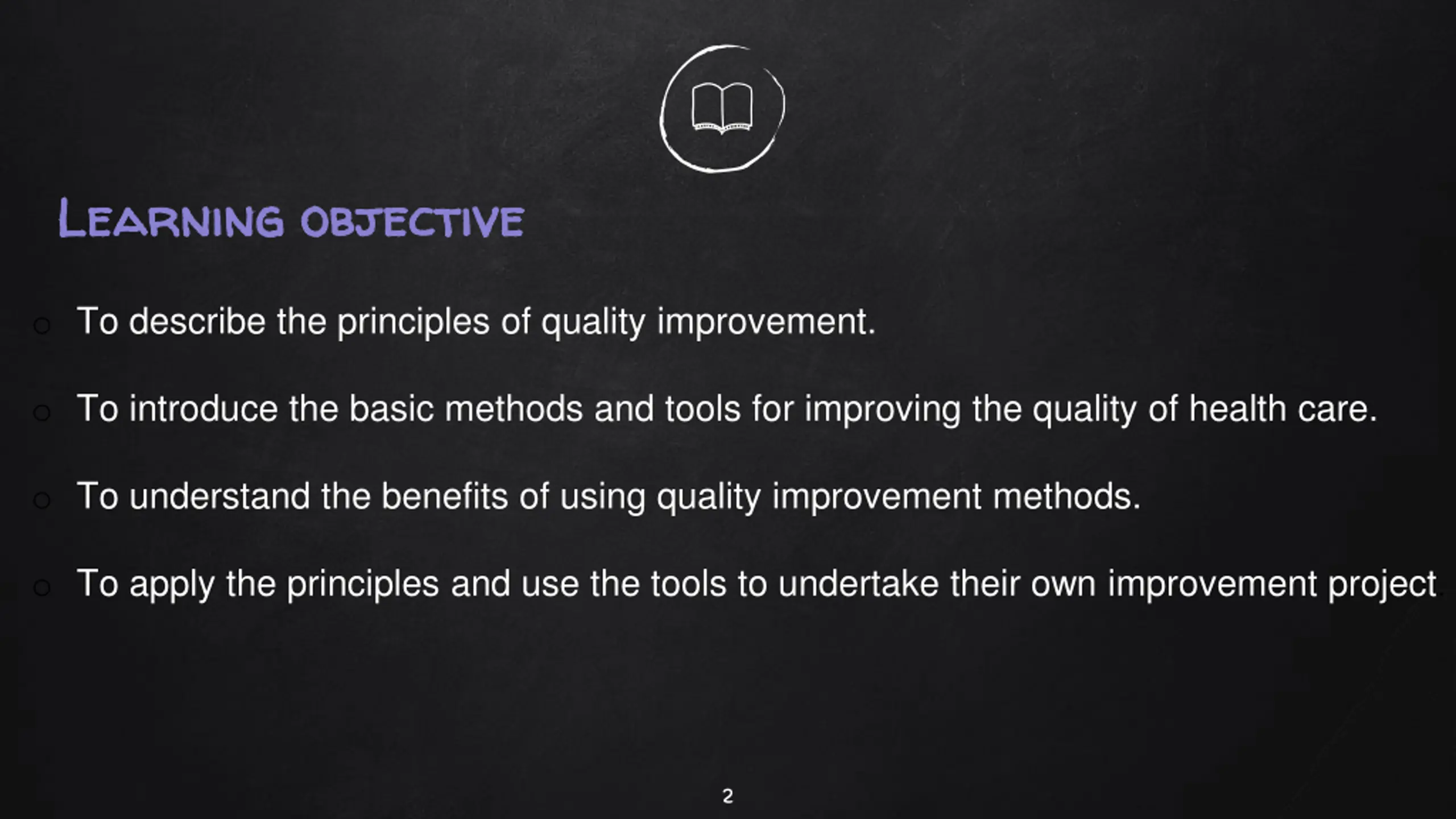 Learning objective Learning objective o To describe the principles of quality improvement. o To introduce the basic methods and tools for improving the quality of health care. o To understand the benefits of using quality improvement methods. o To apply the principles and use the tools to undertake their own improvement project. 2