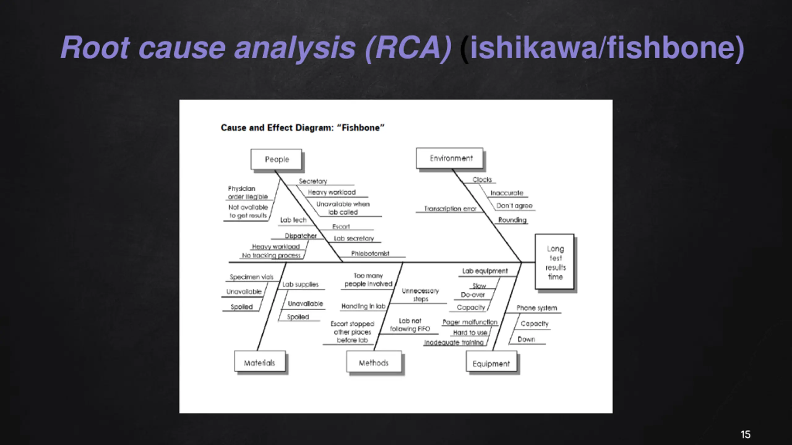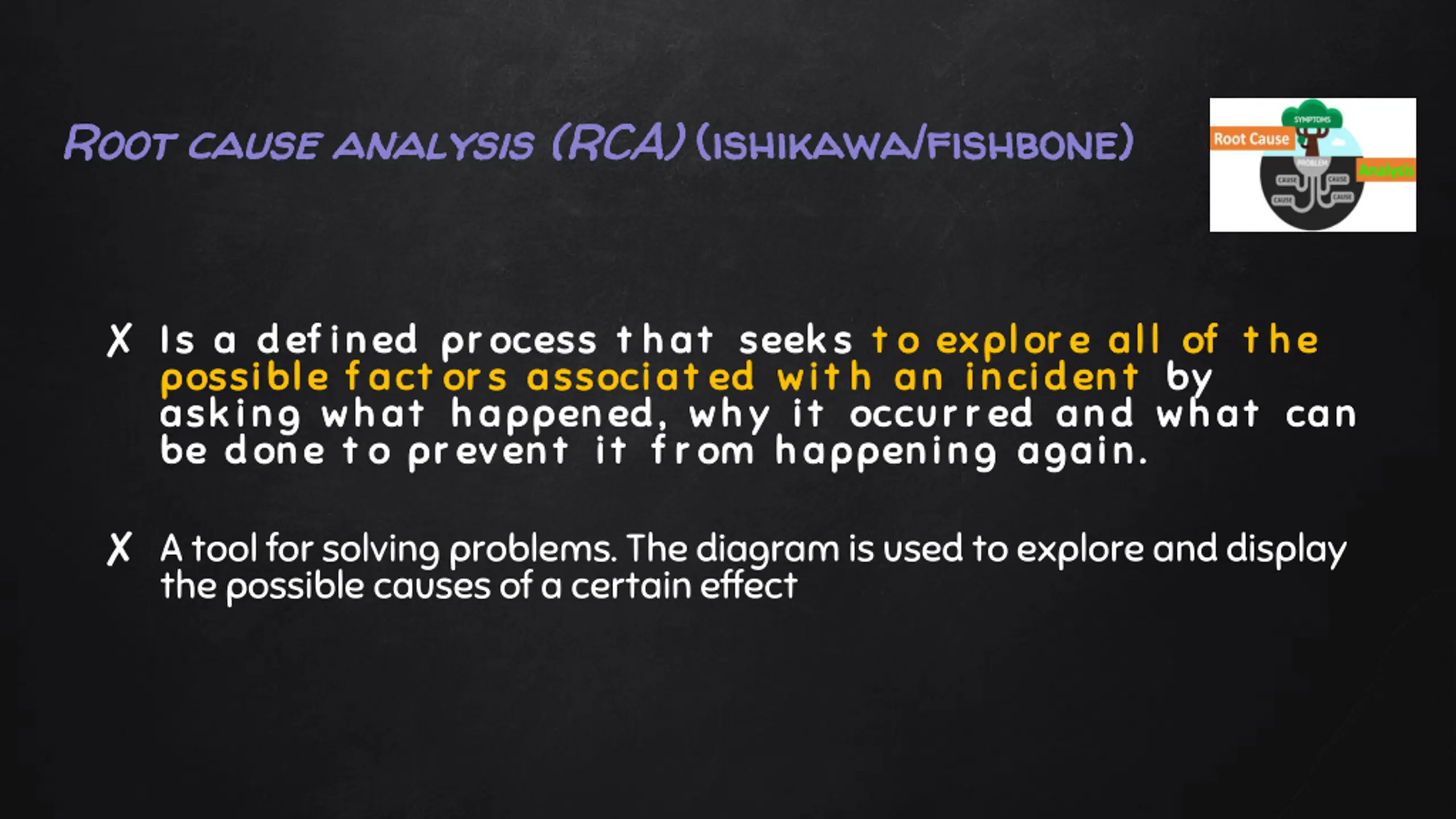 Root cause analysis (RCA) Root cause analysis (RCA) ( (ishikawa ishikawa/fishbone) /fishbone) Is a def ined pr ocess t hat seeks Is a def ined pr ocess t hat seeks t o explor e all of t he possible f act or s associat ed wit h an incident possible f act or s associat ed wit h an incident by asking what happened, why it occur r ed and what can asking what happened, why it occur r ed and what can be done t o pr event it f r om happening again. be done t o pr event it f r om happening again. t o explor e all of t he by A tool for solving problems. The diagram is used to explore and display the possible causes of a certain effect