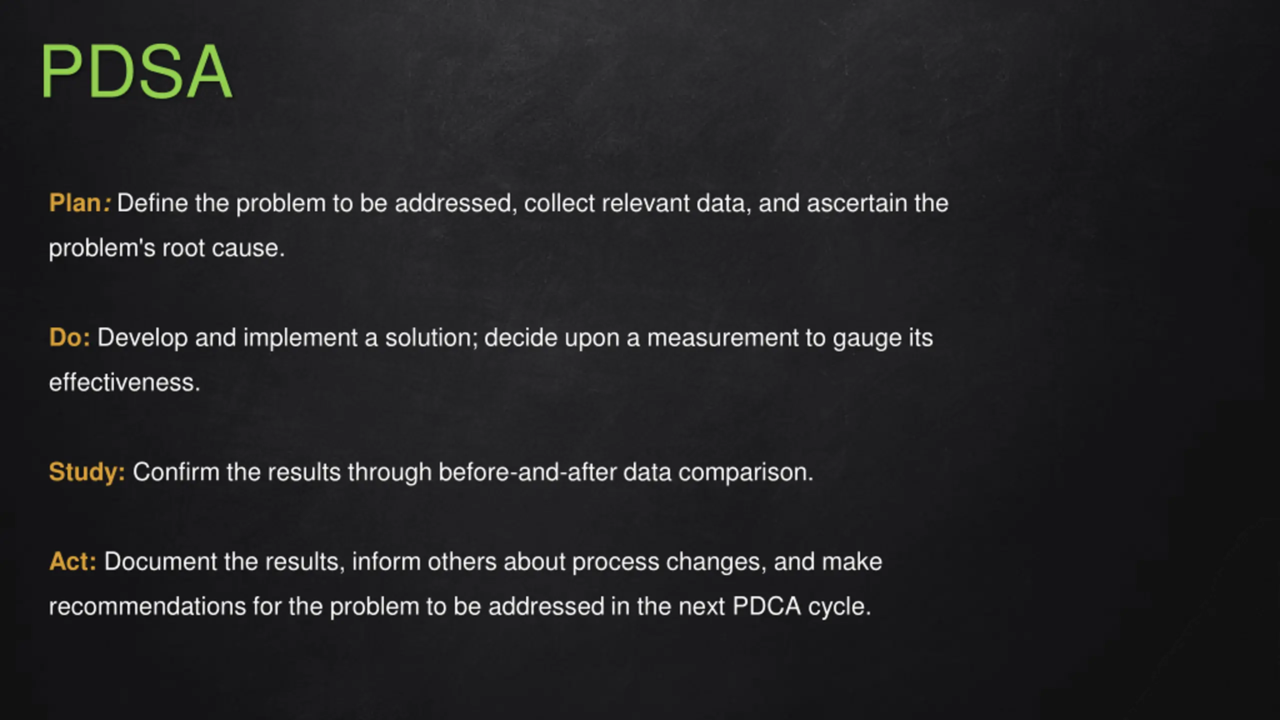 PDSA Plan: Define the problem to be addressed, collect relevant data, and ascertain the problem's root cause. Do: Develop and implement a solution; decide upon a measurement to gauge its effectiveness. Study: Confirm the results through before-and-after data comparison. Act: Document the results, inform others about process changes, and make recommendations for the problem to be addressed in the next PDCA cycle.
