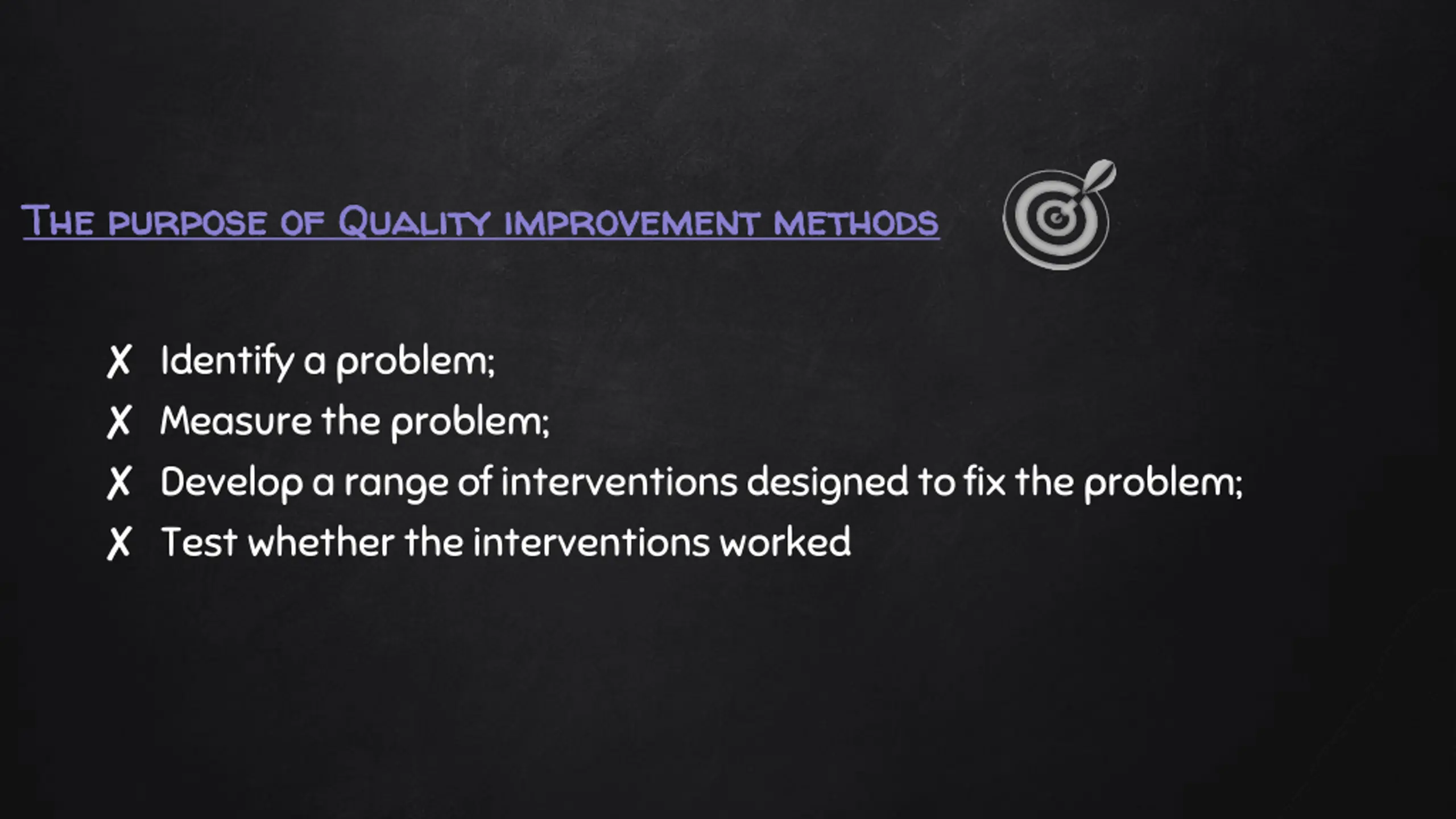 The purpose of Quality improvement methods The purpose of Quality improvement methods Identify a problem; Measure the problem; Develop a range of interventions designed to fix the problem; Test whether the interventions worked