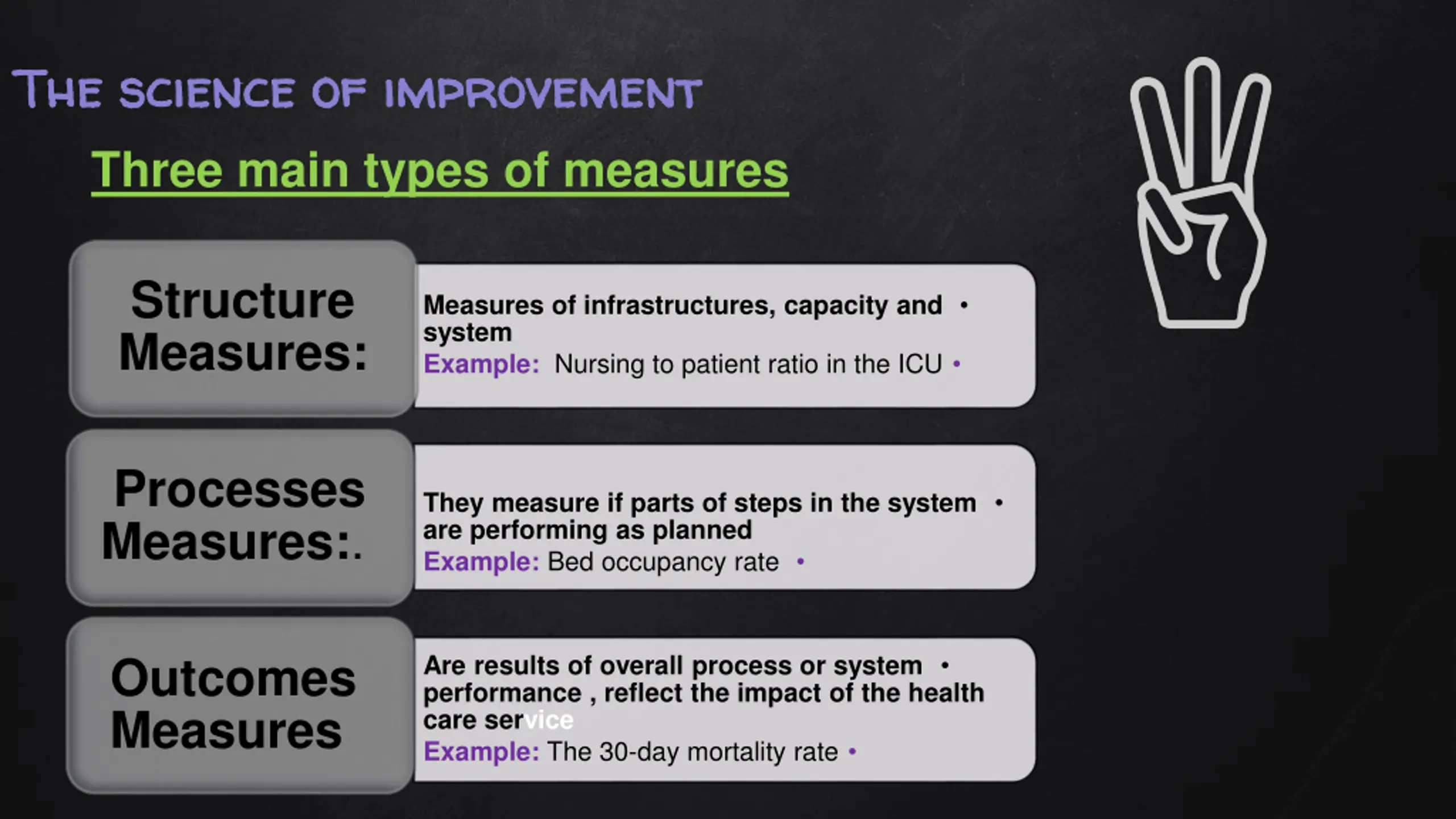 The science of improvement The science of improvement Three main types of measures Structure Measures: Measures of infrastructures, capacity and system Example: Nursing to patient ratio in the ICU Processes Measures:. They measure if parts of steps in the system are performing as planned Example: Bed occupancy rate Outcomes Measures Are results of overall process or system performance , reflect the impact of the health care service Example: The 30-day mortality rate