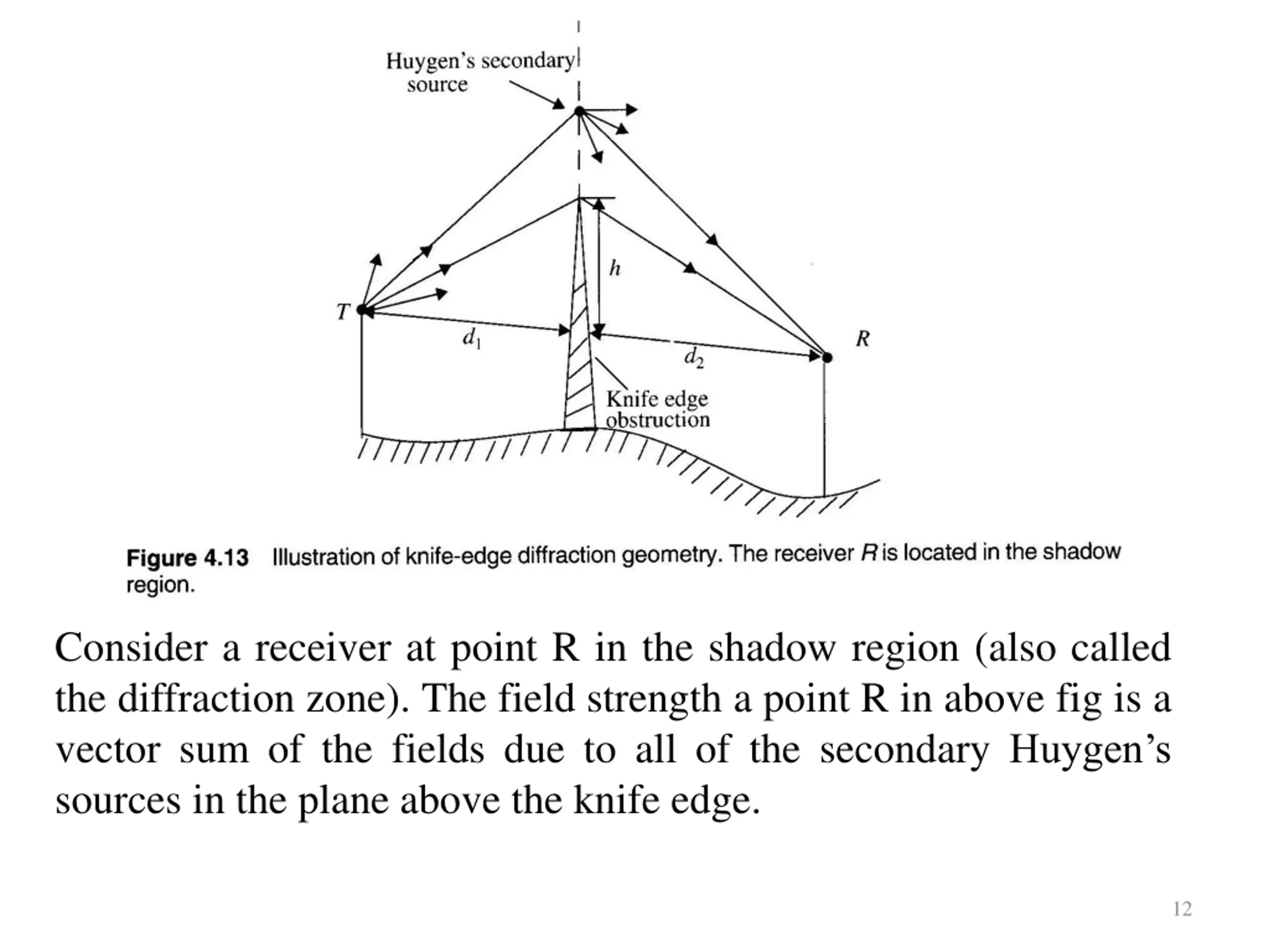Knife-edge Diffraction Model Huygen s secondary source h R d1 d2 Knife edge obstruction When shadowing is caused by a single object such as a hill or mountain, the attenuation caused by diffraction can be estimated by treating the obstruction as a diffracting knife edge. This is the simplest of diffraction models and the diffraction loss in this case can be readily estimated using the classical Fresnel solution for the filed behind a knife edge. 11