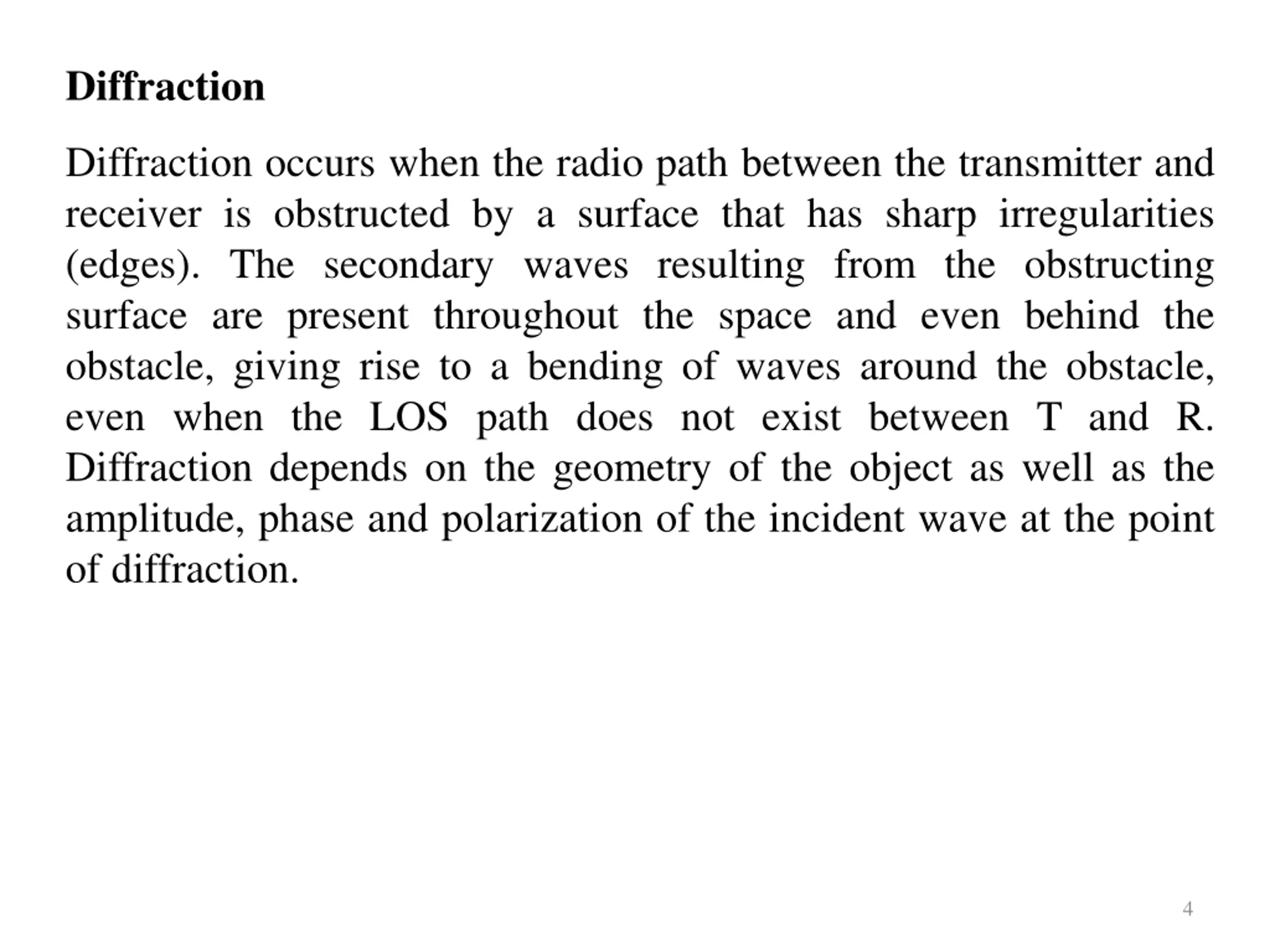 Diffraction Diffraction occurs when the radio path between the transmitter and receiver is obstructed by a surface that has sharp irregularities (edges). The secondary waves resulting from the obstructing surface are present throughout the space and even behind the obstacle, giving rise to a bending of waves around the obstacle, even when the LOS path does not exist between T and R. Diffraction depends on the geometry of the object as well as the amplitude, phase and polarization of the incident wave at the point of diffraction. 4