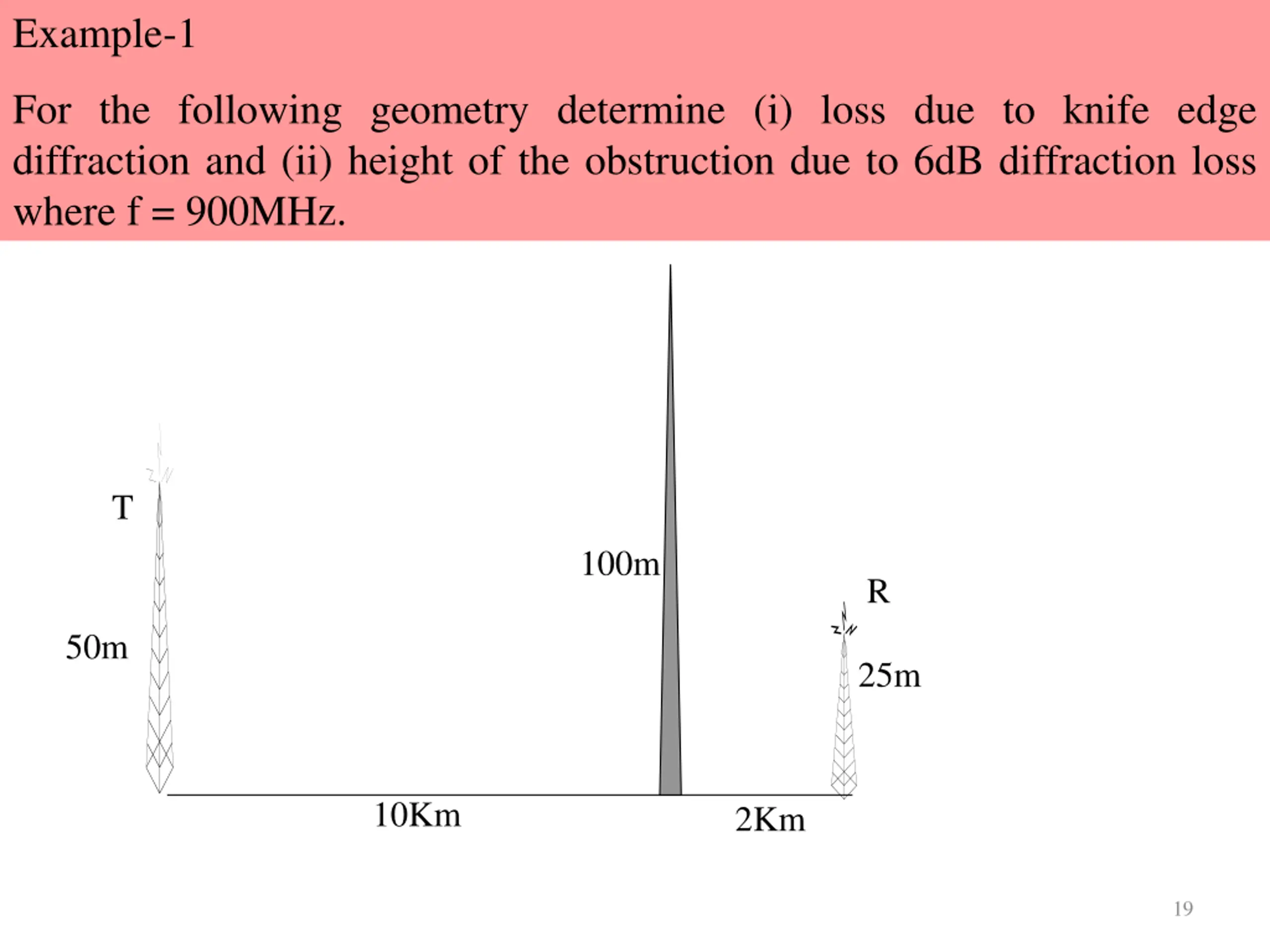 Example-1 For the following geometry determine (i) loss due to knife edge diffraction and (ii) height of the obstruction due to 6dB diffraction loss where f = 900MHz. T 100m R 50m 25m 10Km 2Km 19