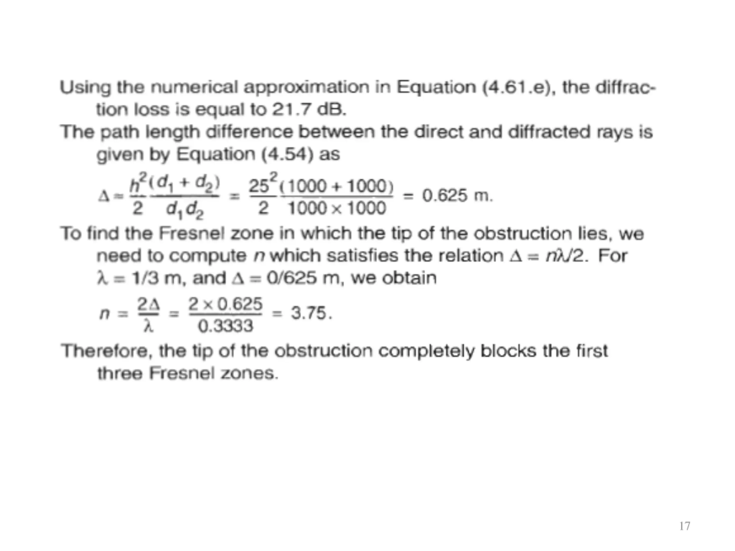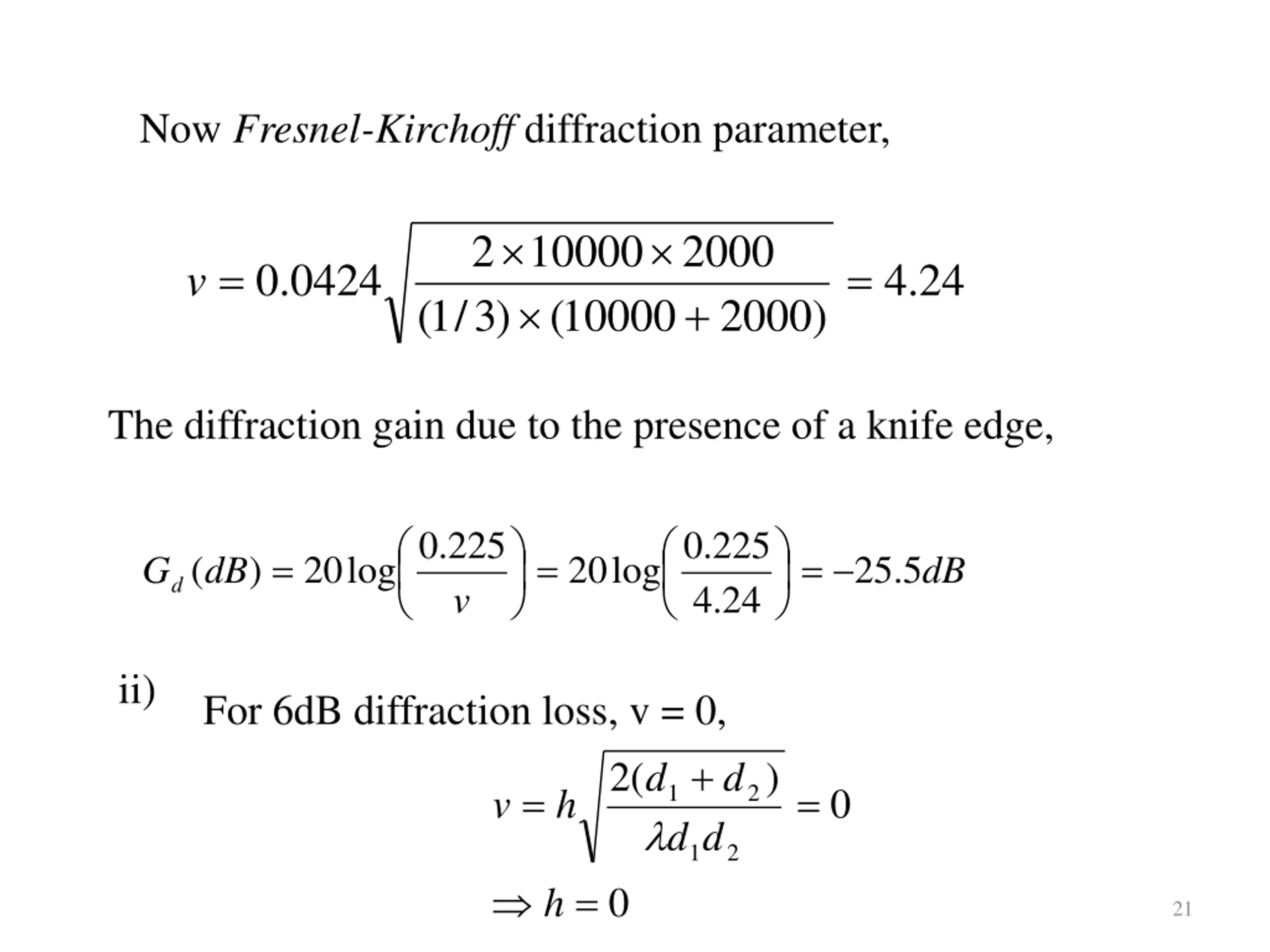 Now Fresnel-Kirchoff diffraction parameter, 2 10000 2000 + = = . 0 0424 . 4 24 v / 1 ( ) 3 10000 ( 2000 ) The diffraction gain due to the presence of a knife edge, . 0 225 . 0 225 = = = ( ) 20 log 20 log 25 5 . Gd dB dB . 4 24 v ii) For 6dB diffraction loss, v = 0, + d ( 2 ) d d = = 1 d 2 0 v h 1 2 = 0 h 21