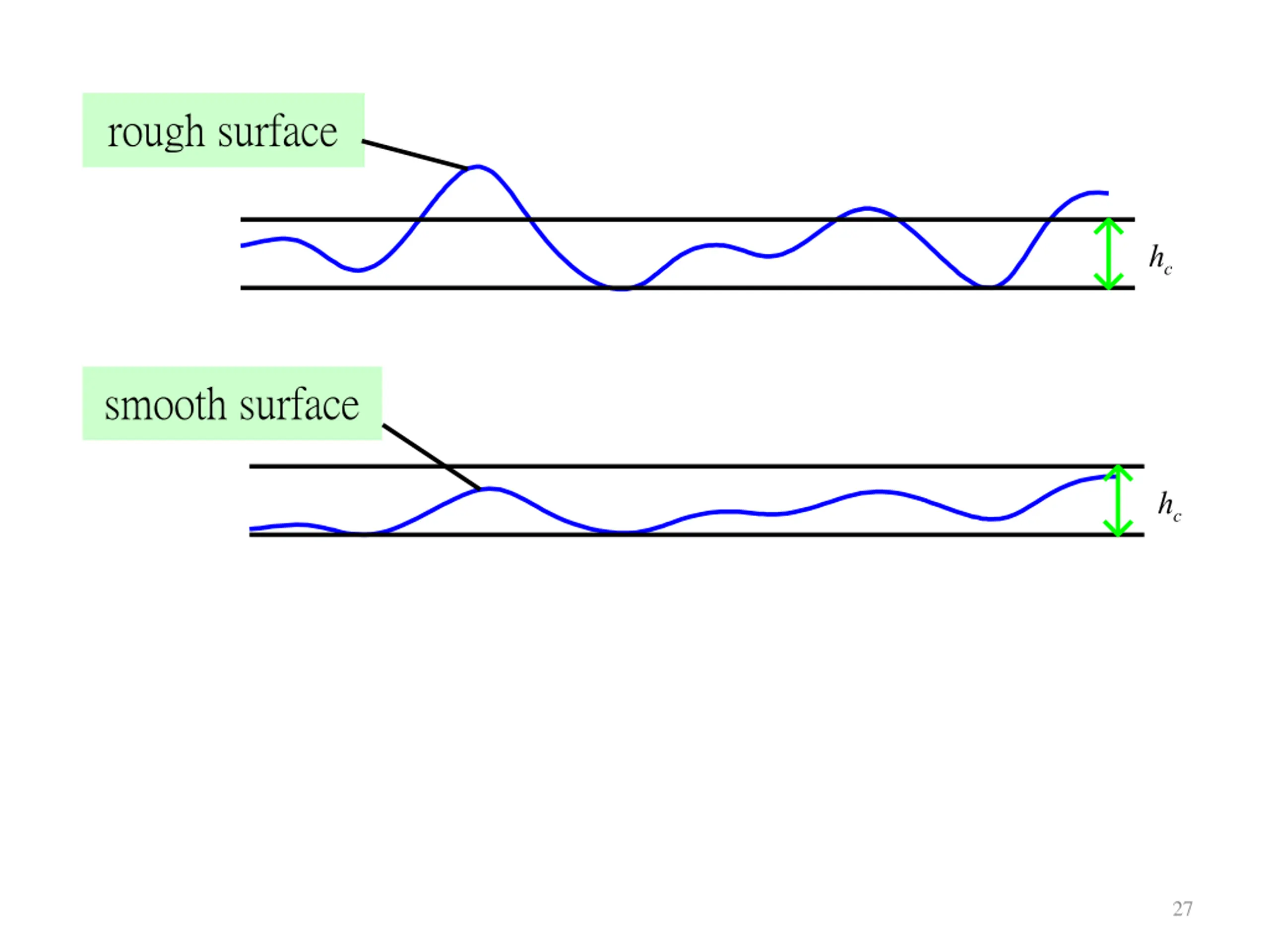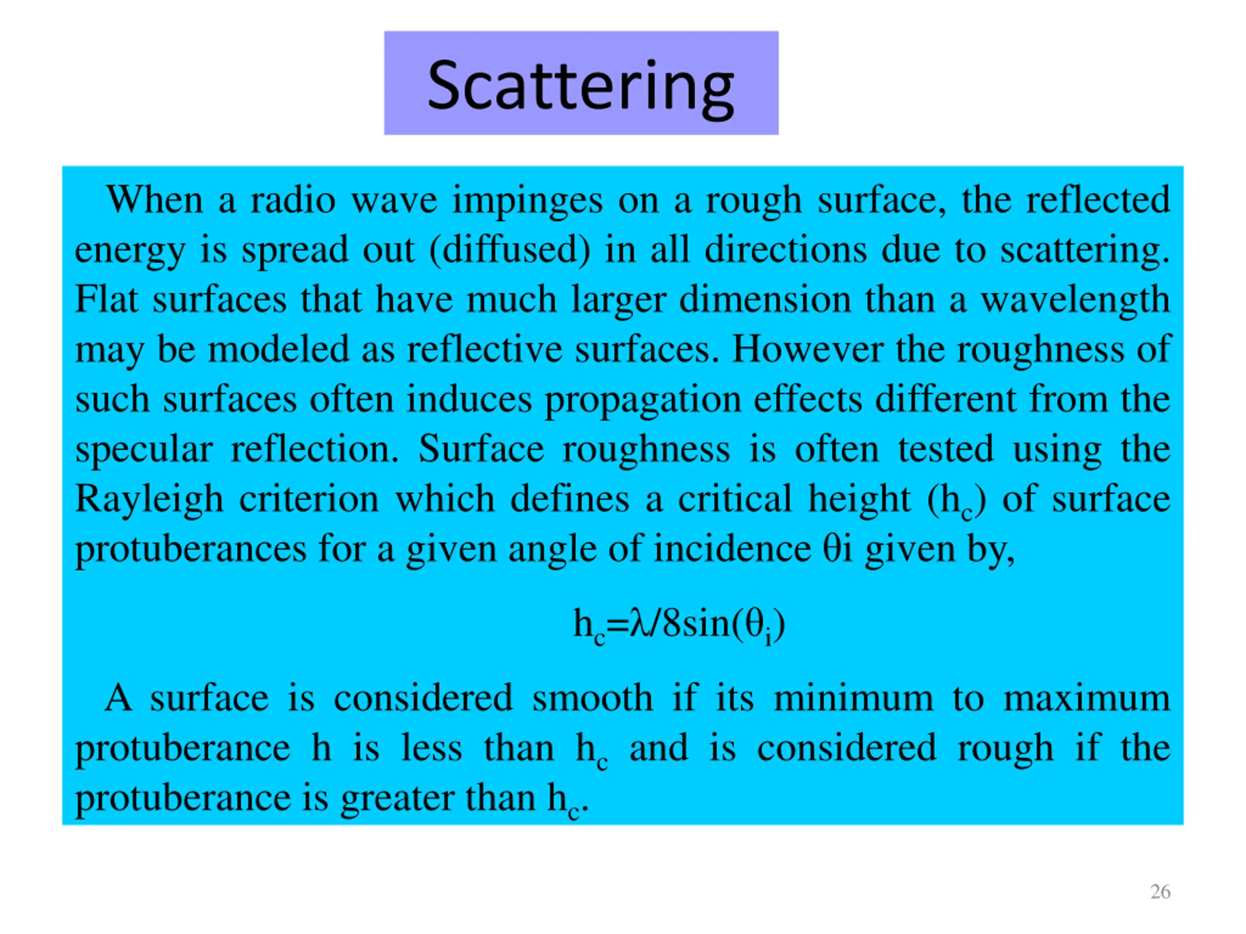 Scattering When a radio wave impinges on a rough surface, the reflected energy is spread out (diffused) in all directions due to scattering. Flat surfaces that have much larger dimension than a wavelength may be modeled as reflective surfaces. However the roughness of such surfaces often induces propagation effects different from the specular reflection. Surface roughness is often tested using the Rayleigh criterion which defines a critical height (hc) of surface protuberances for a given angle of incidence i given by, hc= /8sin( i) A surface is considered smooth if its minimum to maximum protuberance h is less than hc and is considered rough if the protuberance is greater than hc. 26
