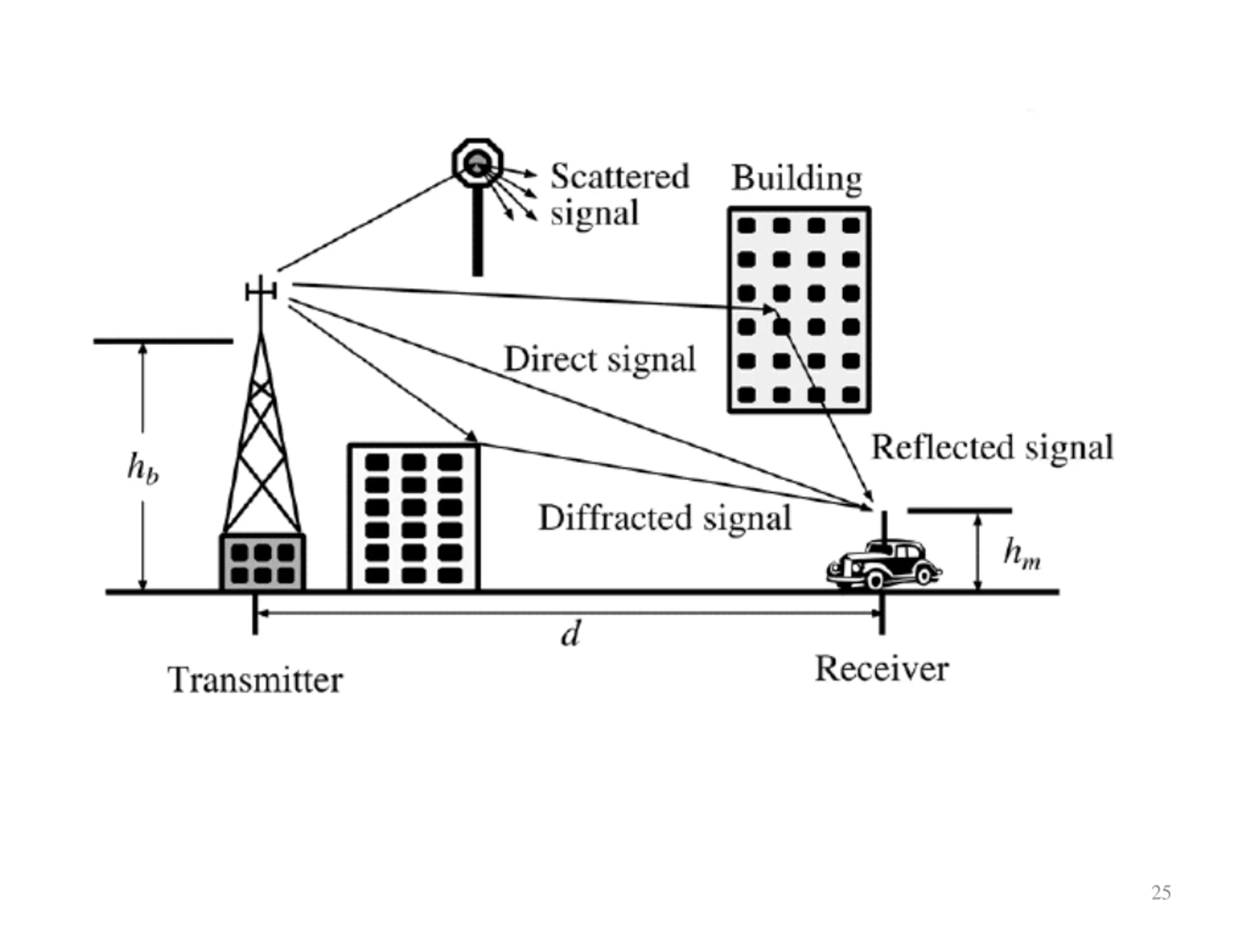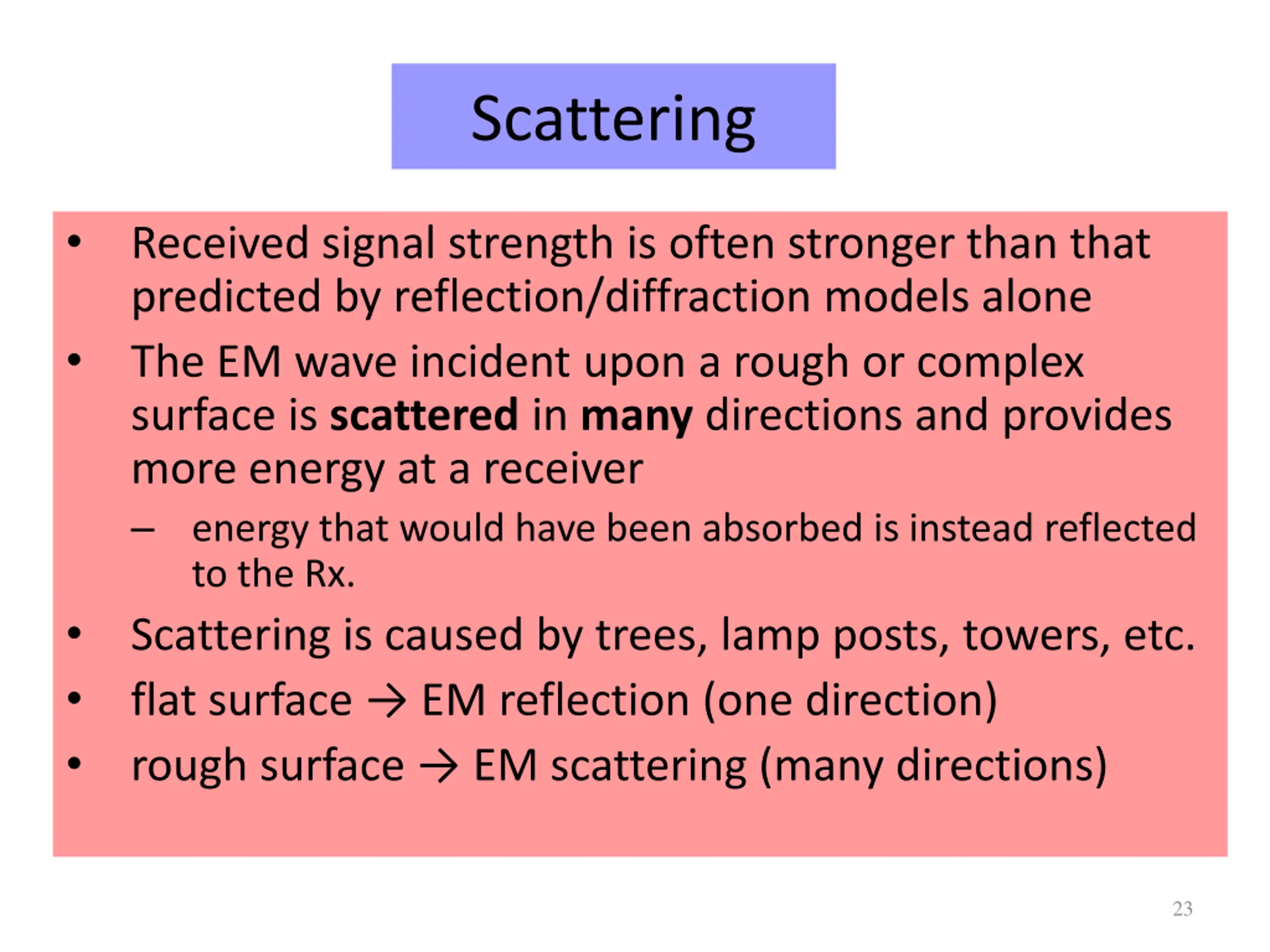 Scattering Received signal strength is often strongerthan that predicted by reflection/diffraction models alone The EM wave incident upon a rough or complex surface is scattered in many directions and provides more energy at a receiver energy that would have been absorbed is instead reflected to the Rx. Scattering is caused by trees, lamp posts, towers, etc. flat surface EM reflection (one direction) rough surface EM scattering (many directions) 23