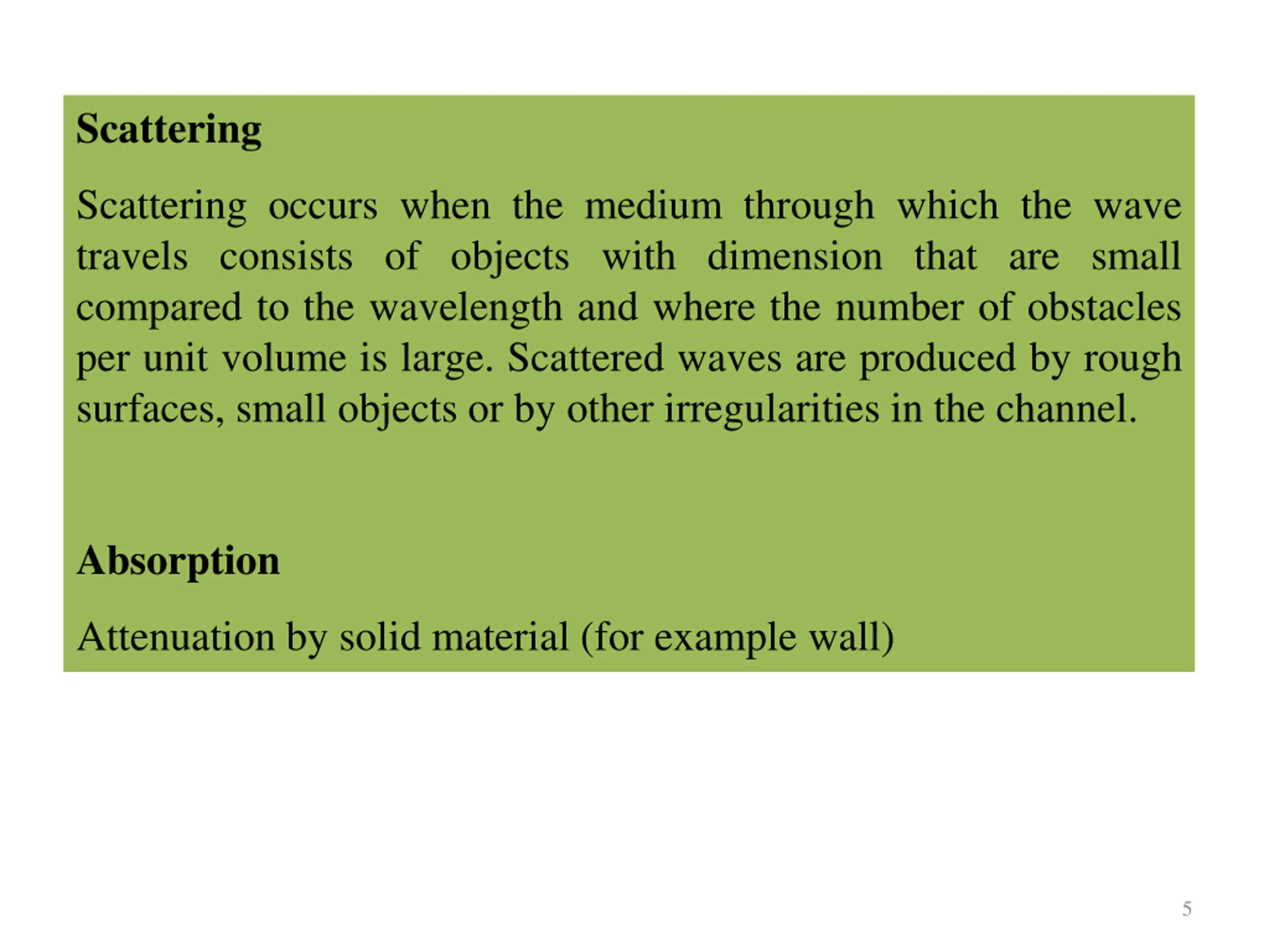 Scattering Scattering occurs when the medium through which the wave travels consists of objects with dimension that are small compared to the wavelength and where the number of obstacles per unit volume is large. Scattered waves are produced by rough surfaces, small objects or by other irregularities in the channel. Absorption Attenuation by solid material (for example wall) 5