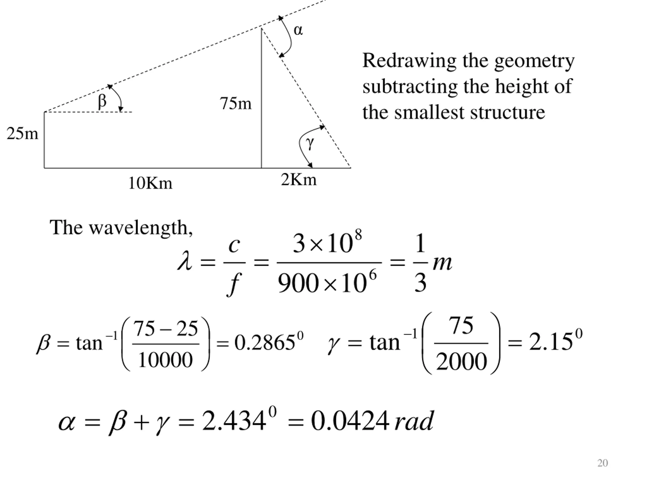 Redrawing the geometry subtracting the height of the smallest structure 75m 25m 2Km 10Km The wavelength, 8 3 10 1 c = = = m 6 3 f 900 10 75 75 25 = = 1 0 tan . 2 15 = = 1 0 tan 2865 . 0 2000 10000 = + = 0= . 2 434 . 0 0424 rad 20