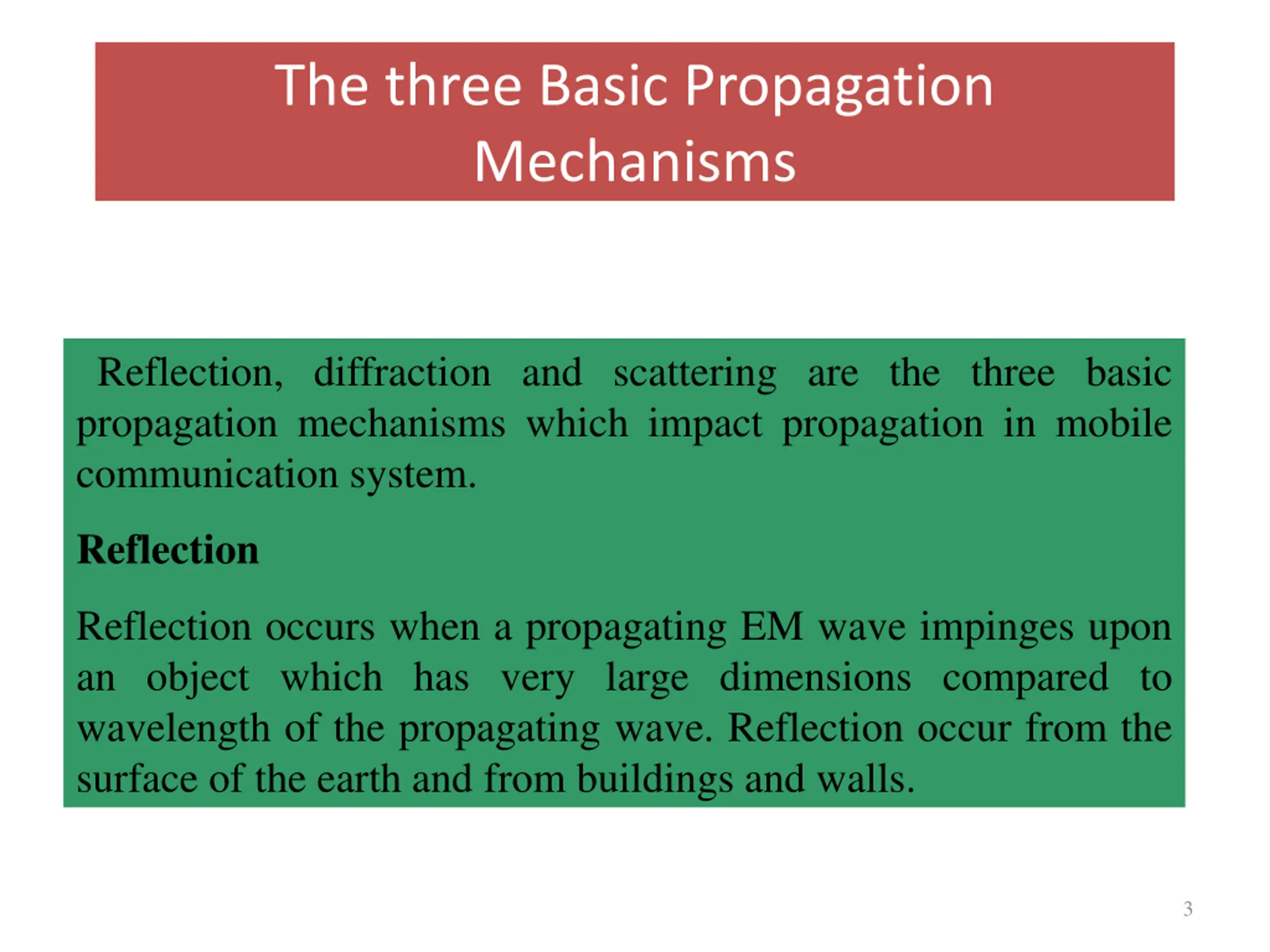 The three Basic Propagation Mechanisms Reflection, diffraction and scattering are the three basic propagation mechanisms which impact propagation in mobile communication system. Reflection Reflection occurs when a propagating EM wave impinges upon an object which has very large dimensions compared to wavelength of the propagating wave. Reflection occur from the surface of the earth and from buildings and walls. 3