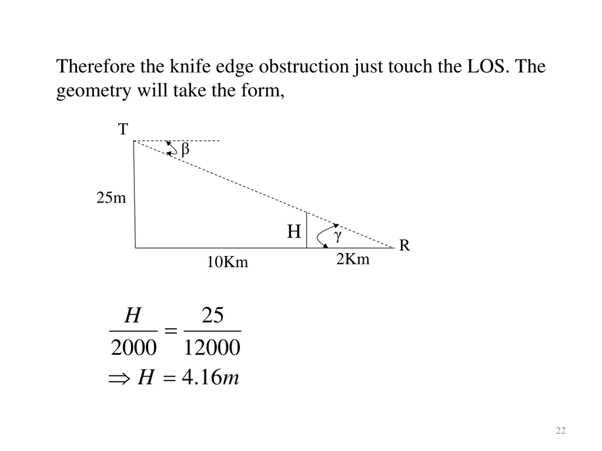 Therefore the knife edge obstruction just touch the LOS. The geometry will take the form, T 25m H 2Km R 10Km 25 H = 2000 12000 = . 4 16 H m 22