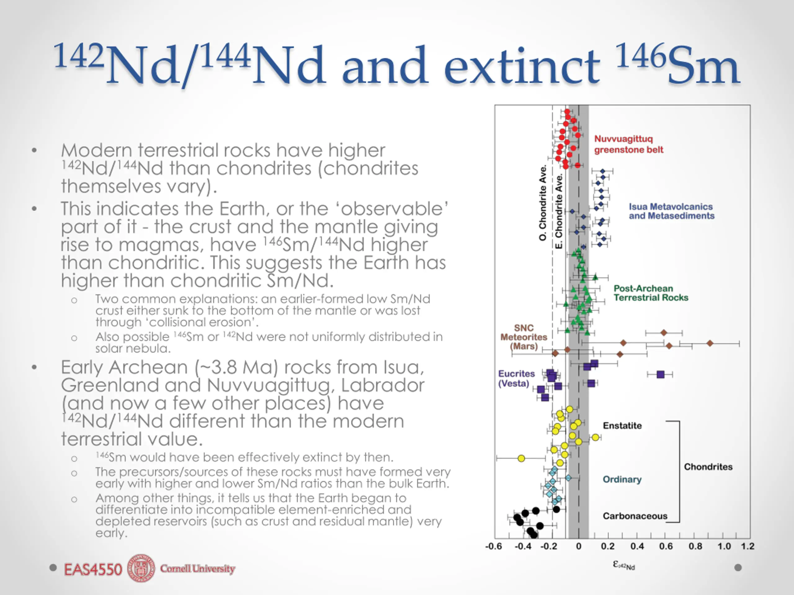 142Nd/144Nd and extinct 146Sm Modern terrestrial rocks have higher 142Nd/144Nd than chondrites (chondrites themselves vary). This indicates the Earth, or the observable part of it - the crust and the mantle giving rise to magmas, have 146Sm/144Nd higher than chondritic. This suggests the Earth has higher than chondritic Sm/Nd. o Two common explanations: an earlier-formed low Sm/Nd crust either sunk to the bottom of the mantle or was lost through collisional erosion . o Also possible 146Sm or 142Nd were not uniformly distributed in solar nebula. Early Archean (~3.8 Ma) rocks from Isua, Greenland and Nuvvuagittug, Labrador (and now a few other places) have 142Nd/144Nd different than the modern terrestrial value. o o The precursors/sources of these rocks must have formed very early with higher and lower Sm/Nd ratios than the bulk Earth. o Among other things, it tells us that the Earth began to differentiate into incompatible element-enriched and depleted reservoirs (such as crust and residual mantle) very early. 146Sm would have been effectively extinct by then.