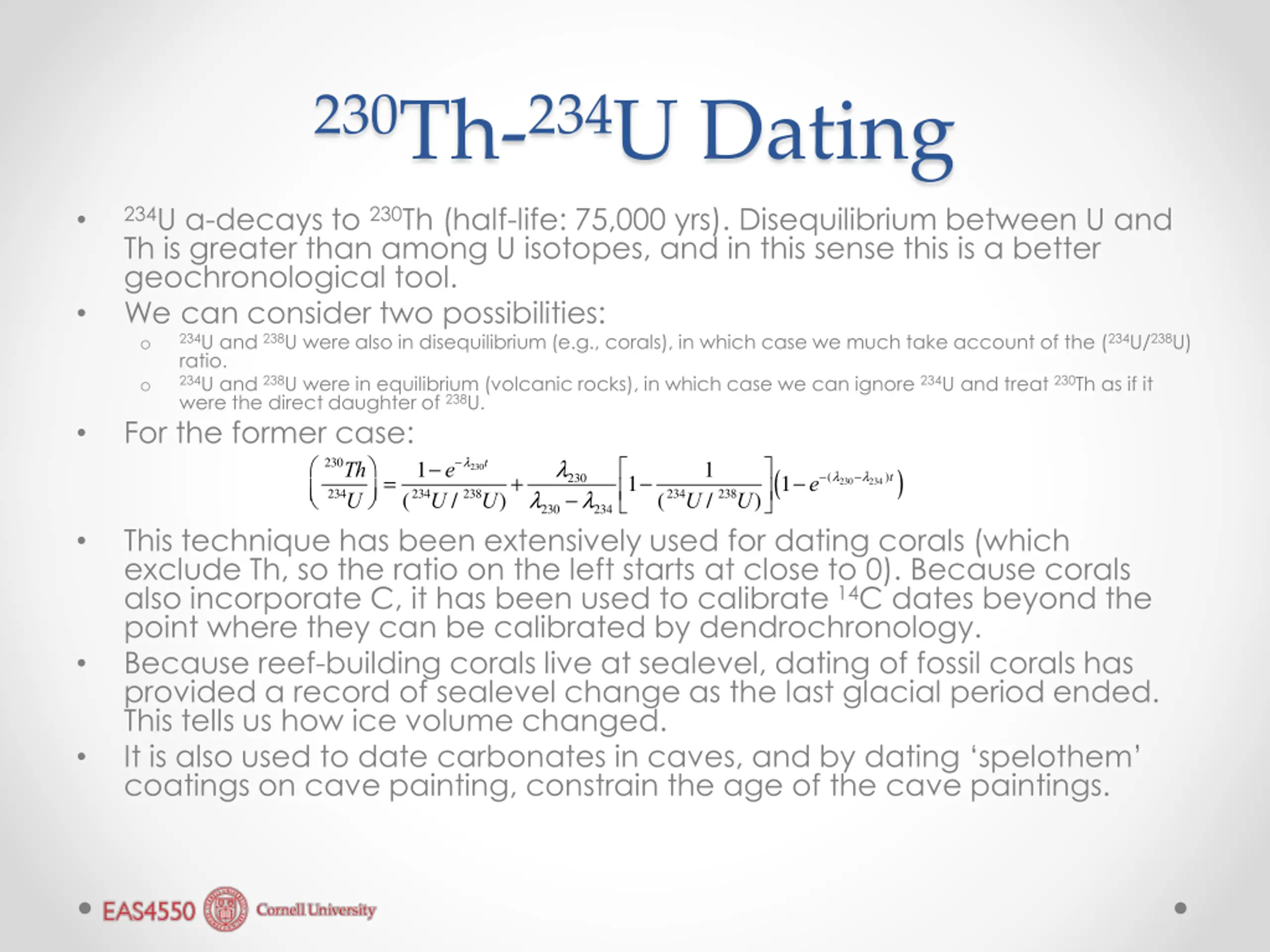 230Th-234U Dating 234U -decays to 230Th (half-life: 75,000 yrs). Disequilibrium between U and Th is greater than among U isotopes, and in this sense this is a better geochronological tool. We can consider two possibilities: o ratio. o were the direct daughter of 238U. For the former case: 230Th 234U l230-l234 234U and 238U were also in disequilibrium (e.g., corals), in which case we much take account of the (234U/238U) 234U and 238U were in equilibrium (volcanic rocks), in which case we can ignore 234U and treat 230Th as if it = 1-e-l230t (234U /238U)+ l230 1-e-(l230-l234)t 1 ( ) 1- (234U /238U) This technique has been extensively used for dating corals (which exclude Th, so the ratio on the left starts at close to 0). Because corals also incorporate C, it has been used to calibrate 14C dates beyond the point where they can be calibrated by dendrochronology. Because reef-building corals live at sealevel, dating of fossil corals has provided a record of sealevel change as the last glacial period ended. This tells us how ice volume changed. It is also used to date carbonates in caves, and by dating spelothem coatings on cave painting, constrain the age of the cave paintings.