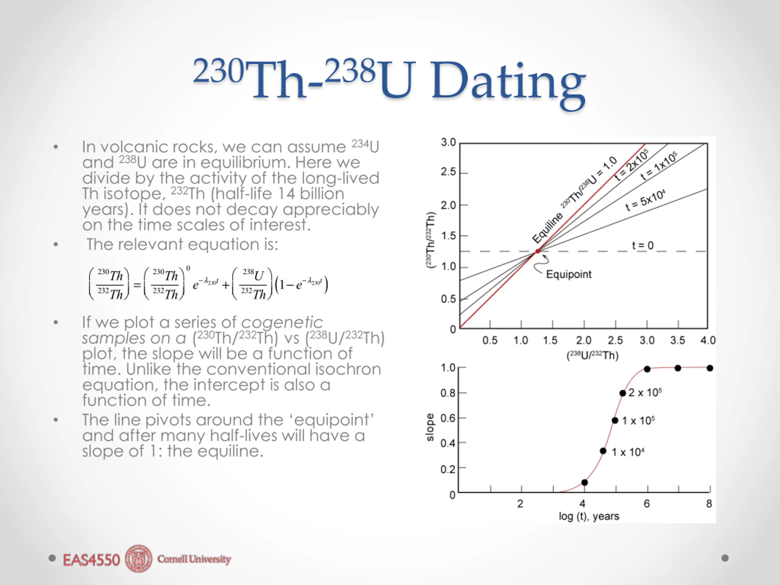 230Th-238U Dating In volcanic rocks, we can assume 234U and 238U are in equilibrium. Here we divide by the activity of the long-lived Th isotope, 232Th (half-life 14 billion years). It does not decay appreciably on the time scales of interest. The relevant equation is: 0 = 1-e-l230t 230Th 232Th 230Th 232Th 238U 232Th ( ) e-l230t+ If we plot a series of cogenetic samples on a (230Th/232Th) vs (238U/232Th) plot, the slope will be a function of time. Unlike the conventional isochron equation, the intercept is also a function of time. The line pivots around the equipoint and after many half-lives will have a slope of 1: the equiline.