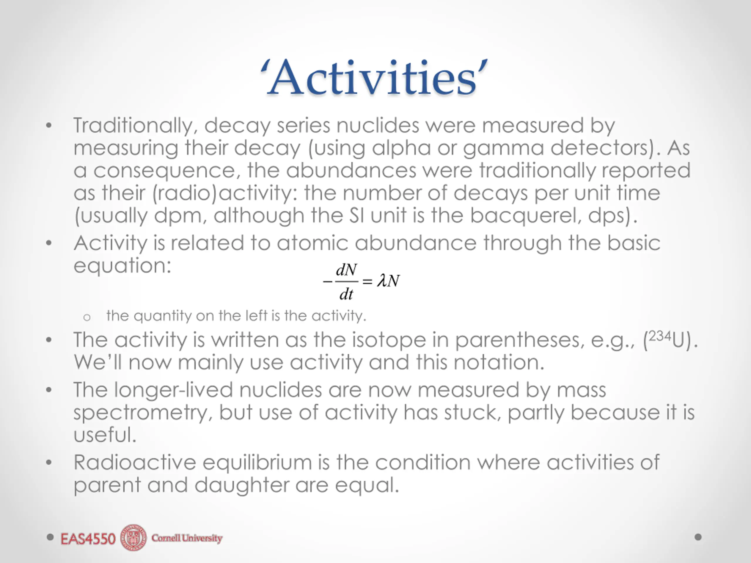 Activities Traditionally, decay series nuclides were measured by measuring their decay (using alpha or gamma detectors). As a consequence, the abundances were traditionally reported as their (radio)activity: the number of decays per unit time (usually dpm, although the SI unit is the bacquerel, dps). Activity is related to atomic abundance through the basic equation: -dN dt = lN the quantity on the left is the activity. The activity is written as the isotope in parentheses, e.g., (234U). We ll now mainly use activity and this notation. The longer-lived nuclides are now measured by mass spectrometry, but use of activity has stuck, partly because it is useful. Radioactive equilibrium is the condition where activities of parent and daughter are equal. o