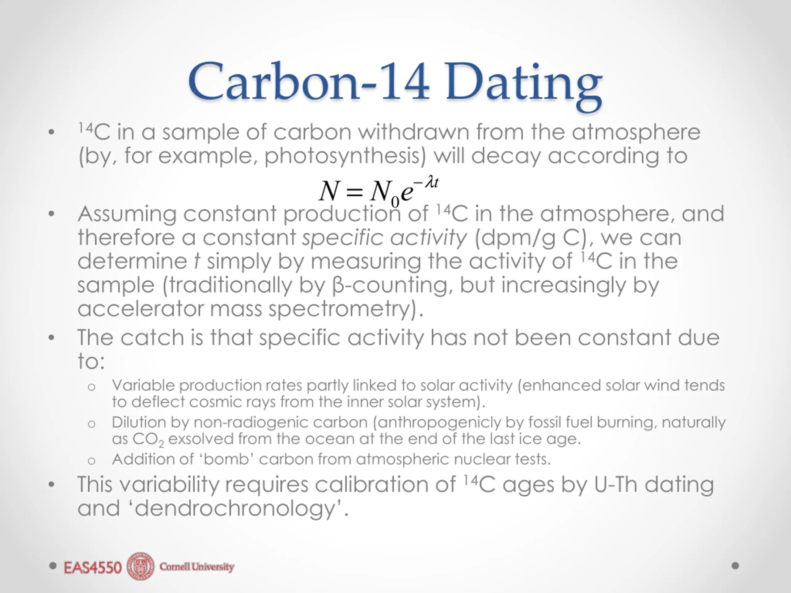 Carbon-14 Dating 14C in a sample of carbon withdrawn from the atmosphere (by, for example, photosynthesis) will decay according to N = N0e-lt Assuming constant production of 14C in the atmosphere, and therefore a constant specific activity (dpm/g C), we can determine t simply by measuring the activity of 14C in the sample (traditionally by -counting, but increasingly by accelerator mass spectrometry). The catch is that specific activity has not been constant due to: o Variable production rates partly linked to solar activity (enhanced solar wind tends to deflect cosmic rays from the inner solar system). o Dilution by non-radiogenic carbon (anthropogenicly by fossil fuel burning, naturally as CO2exsolved from the ocean at the end of the last ice age. o Addition of bomb carbon from atmospheric nuclear tests. This variability requires calibration of 14C ages by U-Th dating and dendrochronology .