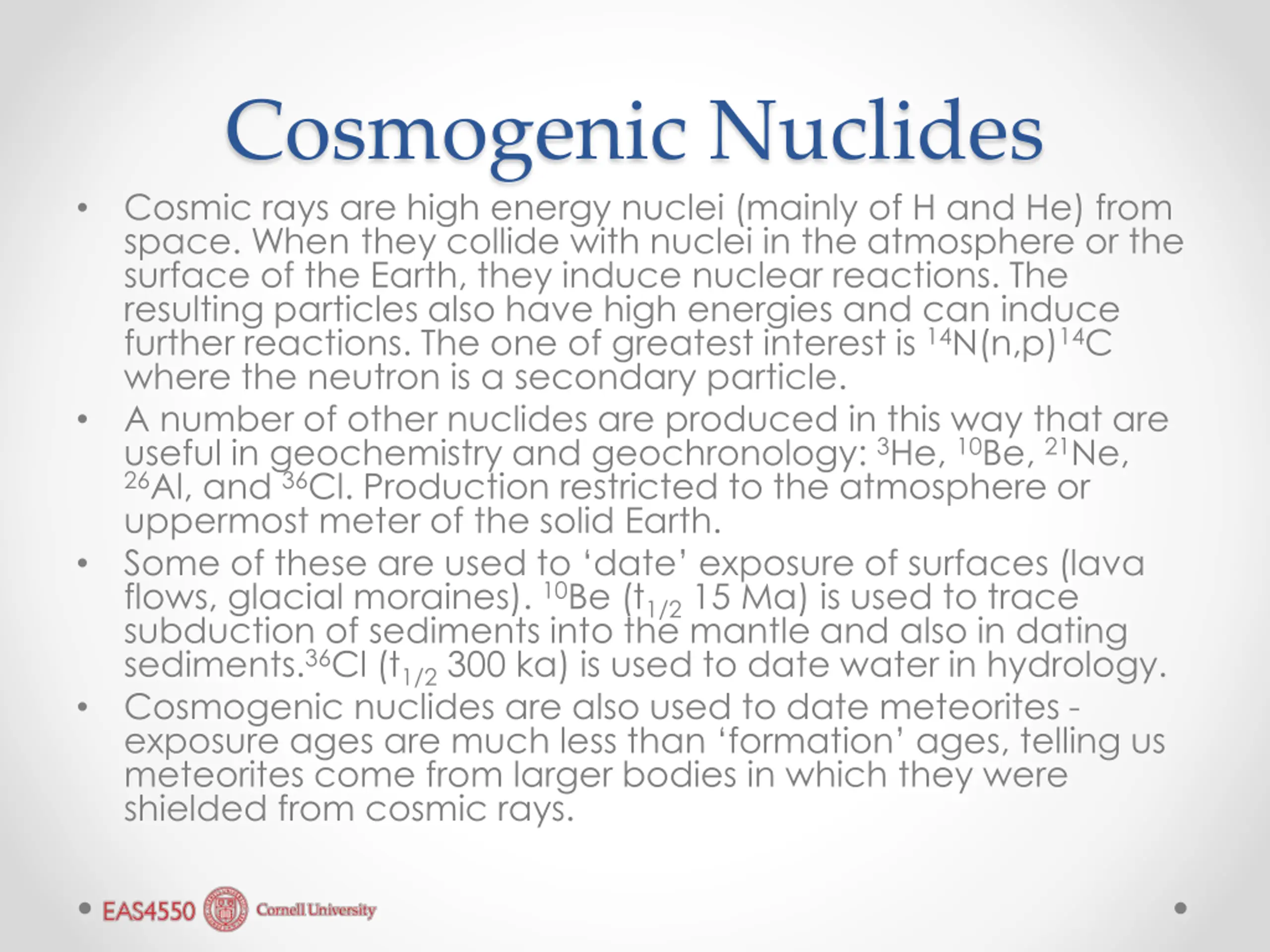 Cosmogenic Nuclides Cosmic rays are high energy nuclei (mainly of H and He) from space. When they collide with nuclei in the atmosphere or the surface of the Earth, they induce nuclear reactions. The resulting particles also have high energies and can induce further reactions. The one of greatest interest is 14N(n,p)14C where the neutron is a secondary particle. A number of other nuclides are produced in this way that are useful in geochemistry and geochronology: 3He, 10Be, 21Ne, 26Al, and 36Cl. Production restricted to the atmosphere or uppermost meter of the solid Earth. Some of these are used to date exposure of surfaces (lava flows, glacial moraines). 10Be (t1/215 Ma) is used to trace subduction of sediments into the mantle and also in dating sediments.36Cl (t1/2300 ka) is used to date water in hydrology. Cosmogenic nuclides are also used to date meteorites - exposure ages are much less than formation ages, telling us meteorites come from larger bodies in which they were shielded from cosmic rays.