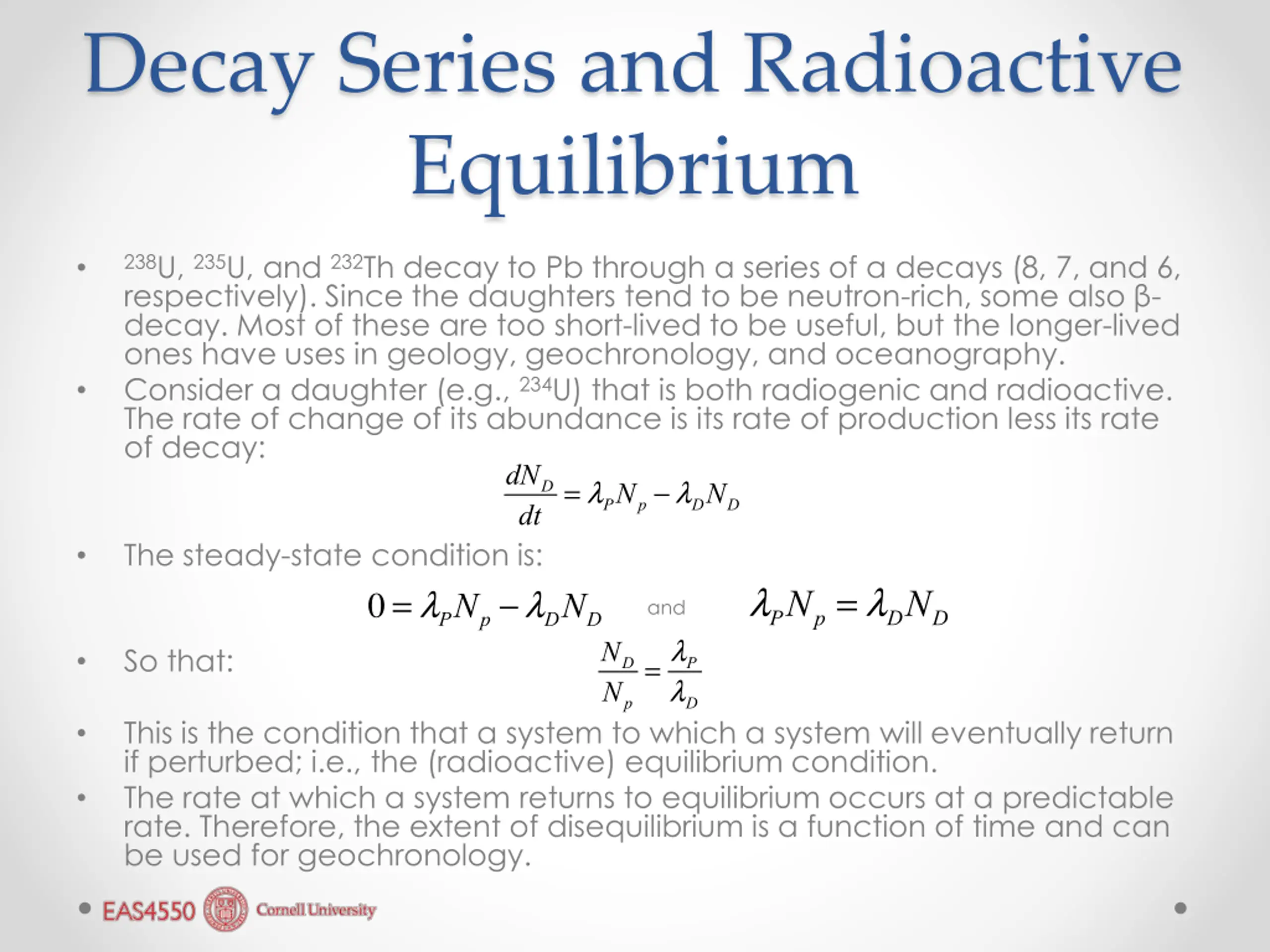 Decay Series and Radioactive Equilibrium 238U, 235U, and 232Th decay to Pb through a series of decays (8, 7, and 6, respectively). Since the daughters tend to be neutron-rich, some also - decay. Most of these are too short-lived to be useful, but the longer-lived ones have uses in geology, geochronology, and oceanography. Consider a daughter (e.g., 234U) that is both radiogenic and radioactive. The rate of change of its abundance is its rate of production less its rate of decay: dND dt = lPNp-lDND The steady-state condition is: lPNp= lDND 0 = lPNp-lDND and =lP lD ND Np So that: This is the condition that a system to which a system will eventually return if perturbed; i.e., the (radioactive) equilibrium condition. The rate at which a system returns to equilibrium occurs at a predictable rate. Therefore, the extent of disequilibrium is a function of time and can be used for geochronology.