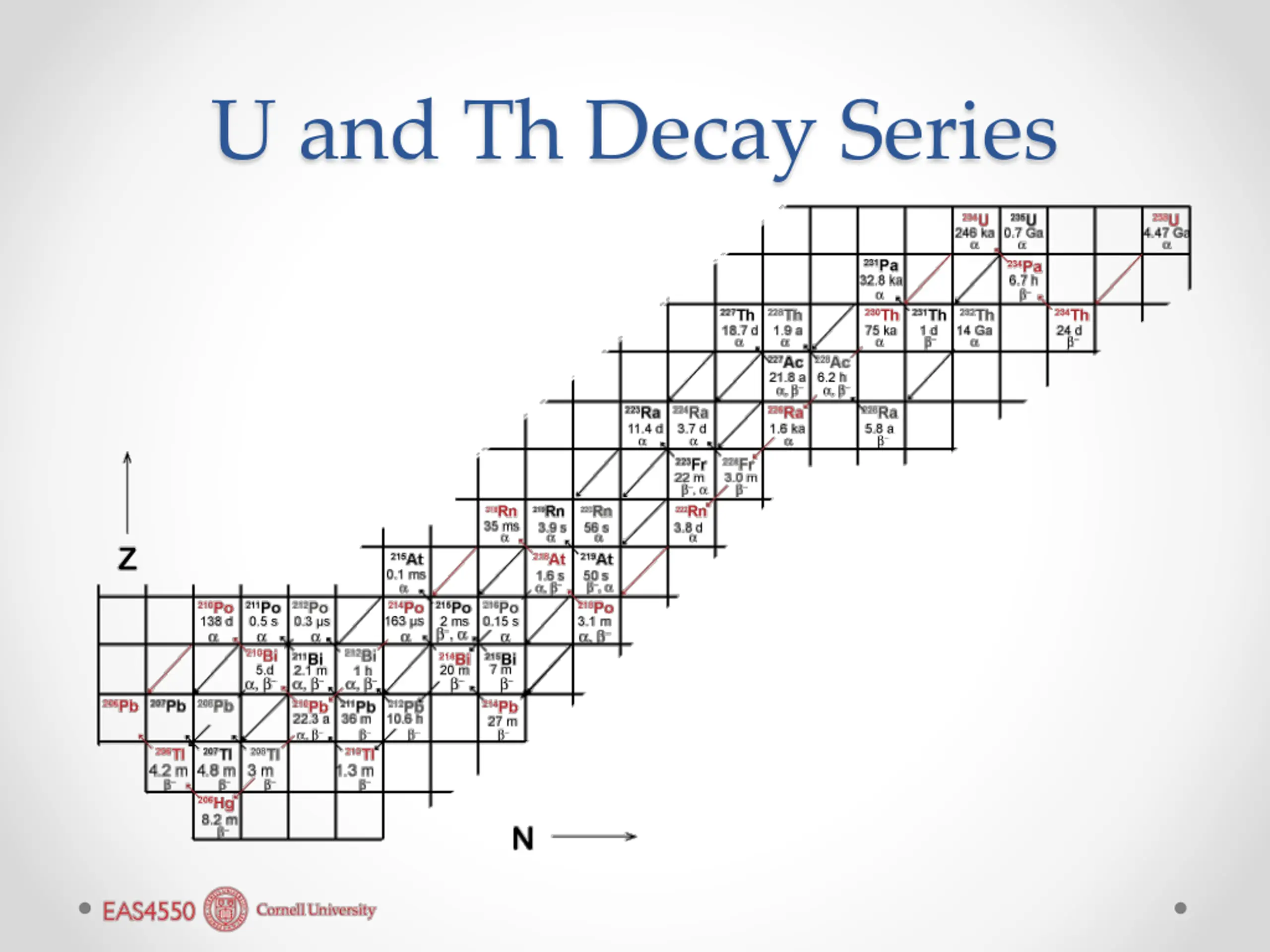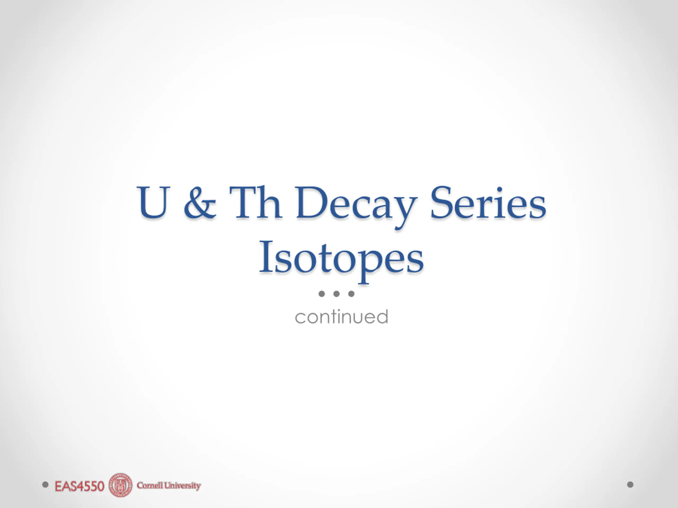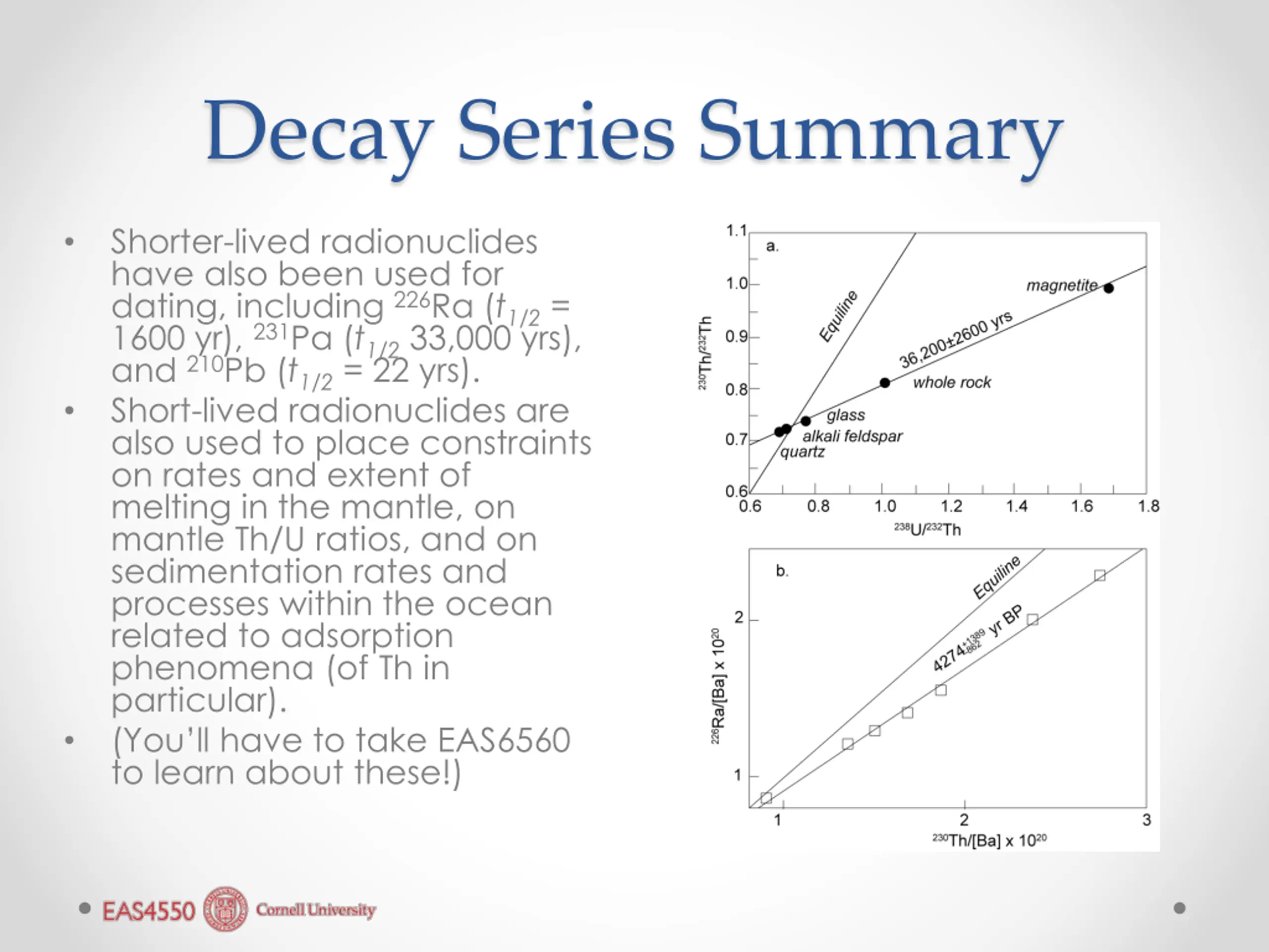 Decay Series Summary Shorter-lived radionuclides have also been used for dating, including 226Ra (t1/2= 1600 yr), 231Pa (t1/233,000 yrs), and 210Pb (t1/2= 22 yrs). Short-lived radionuclides are also used to place constraints on rates and extent of melting in the mantle, on mantle Th/U ratios, and on sedimentation rates and processes within the ocean related to adsorption phenomena (of Th in particular). (You ll have to take EAS6560 to learn about these!)