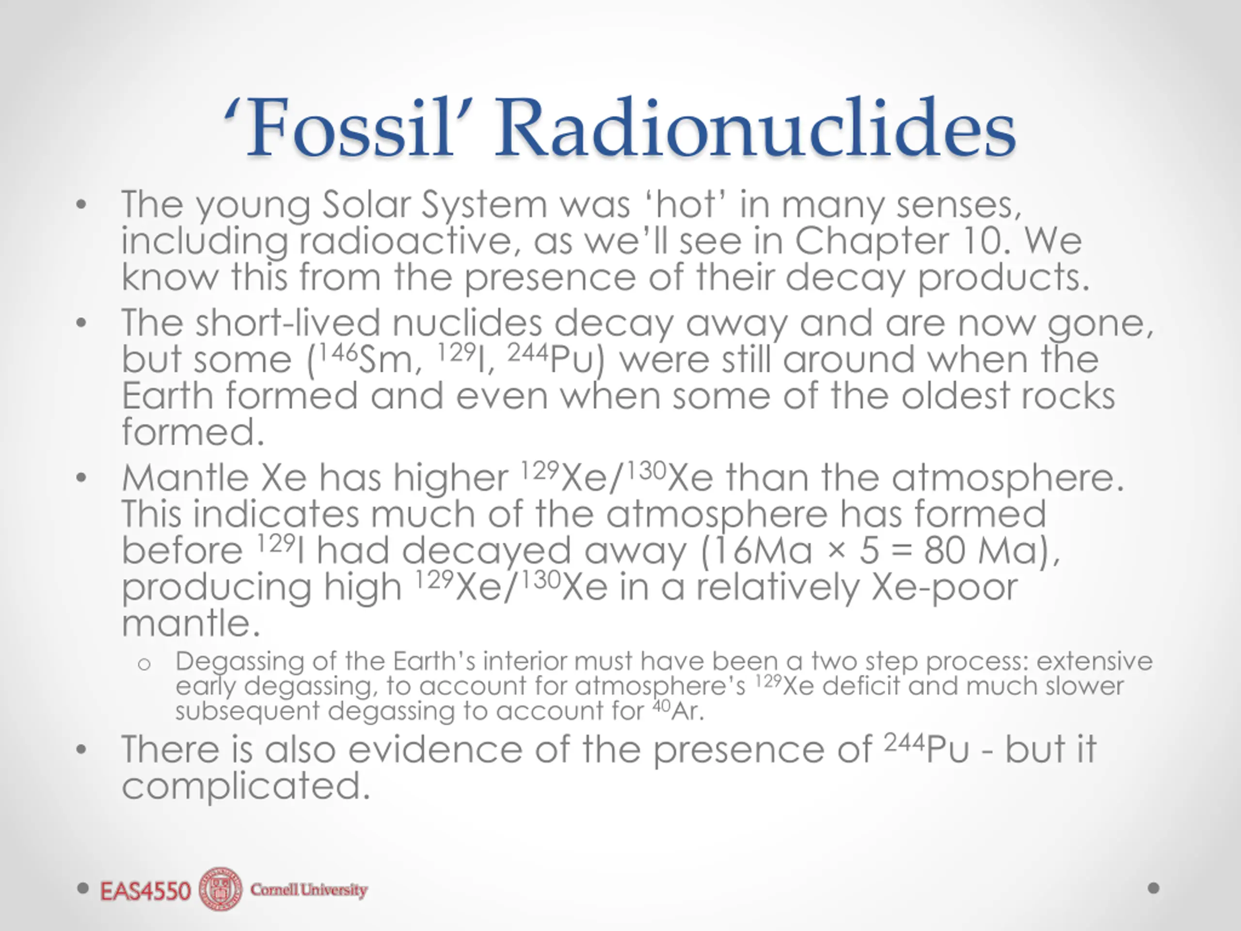 Fossil Radionuclides The young Solar System was hot in many senses, including radioactive, as we ll see in Chapter 10. We know this from the presence of their decay products. The short-lived nuclides decay away and are now gone, but some (146Sm, 129I, 244Pu) were still around when the Earth formed and even when some of the oldest rocks formed. Mantle Xe has higher 129Xe/130Xe than the atmosphere. This indicates much of the atmosphere has formed before 129I had decayed away (16Ma 5 = 80 Ma), producing high 129Xe/130Xe in a relatively Xe-poor mantle. o Degassing of the Earth s interior must have been a two step process: extensive early degassing, to account for atmosphere s 129Xe deficit and much slower subsequent degassing to account for 40Ar. There is also evidence of the presence of 244Pu - but it complicated.