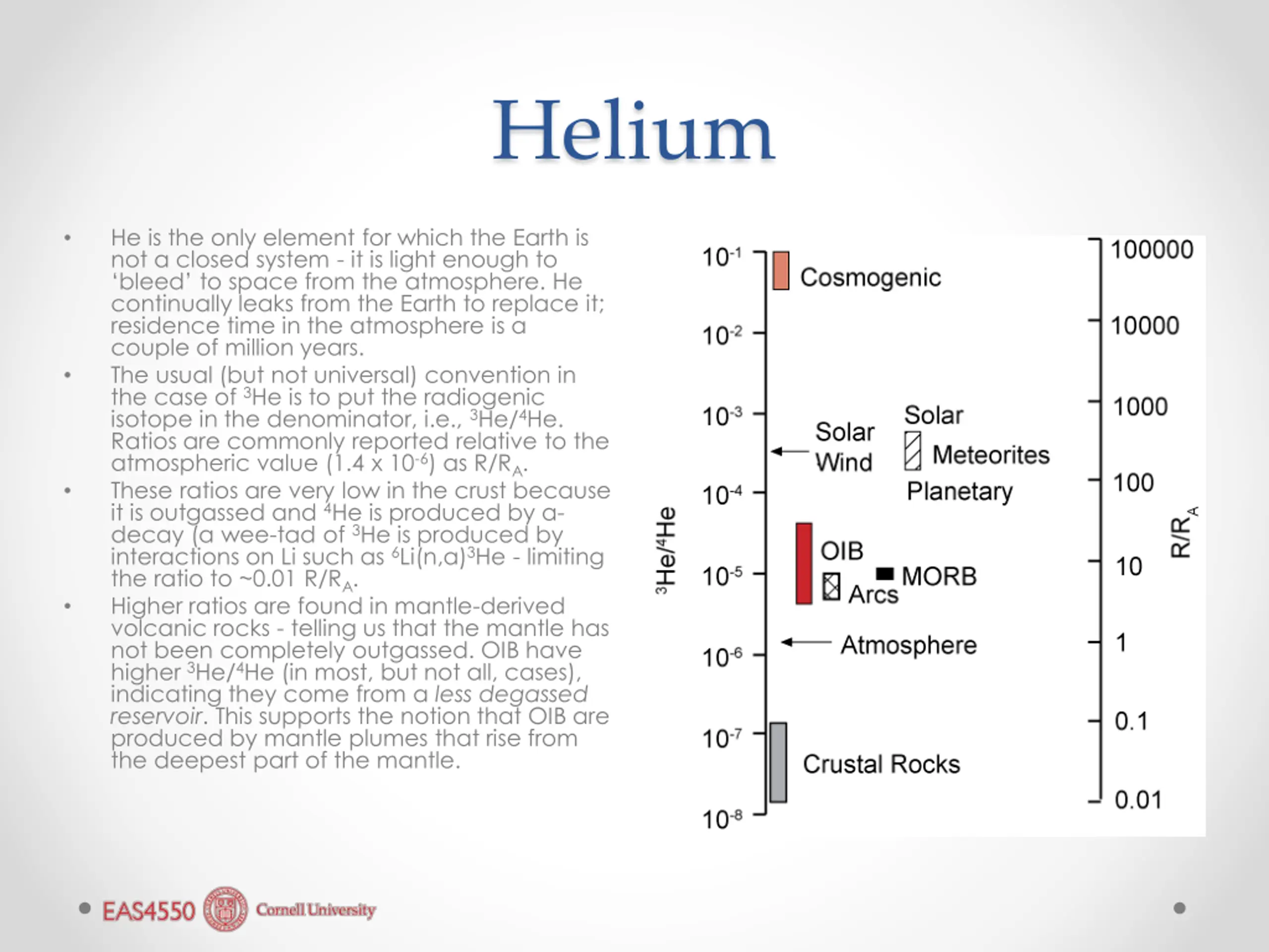 Helium He is the only element for which the Earth is not a closed system - it is light enough to bleed to space from the atmosphere. He continually leaks from the Earth to replace it; residence time in the atmosphere is a couple of million years. The usual (but not universal) convention in the case of 3He is to put the radiogenic isotope in the denominator, i.e., 3He/4He. Ratios are commonly reported relative to the atmospheric value (1.4 x 10-6) as R/RA. These ratios are very low in the crust because it is outgassed and 4He is produced by - decay (a wee-tad of 3He is produced by interactions on Li such as 6Li(n, )3He - limiting the ratio to ~0.01 R/RA. Higher ratios are found in mantle-derived volcanic rocks - telling us that the mantle has not been completely outgassed. OIB have higher 3He/4He (in most, but not all, cases), indicating they come from a less degassed reservoir. This supports the notion that OIB are produced by mantle plumes that rise from the deepest part of the mantle.