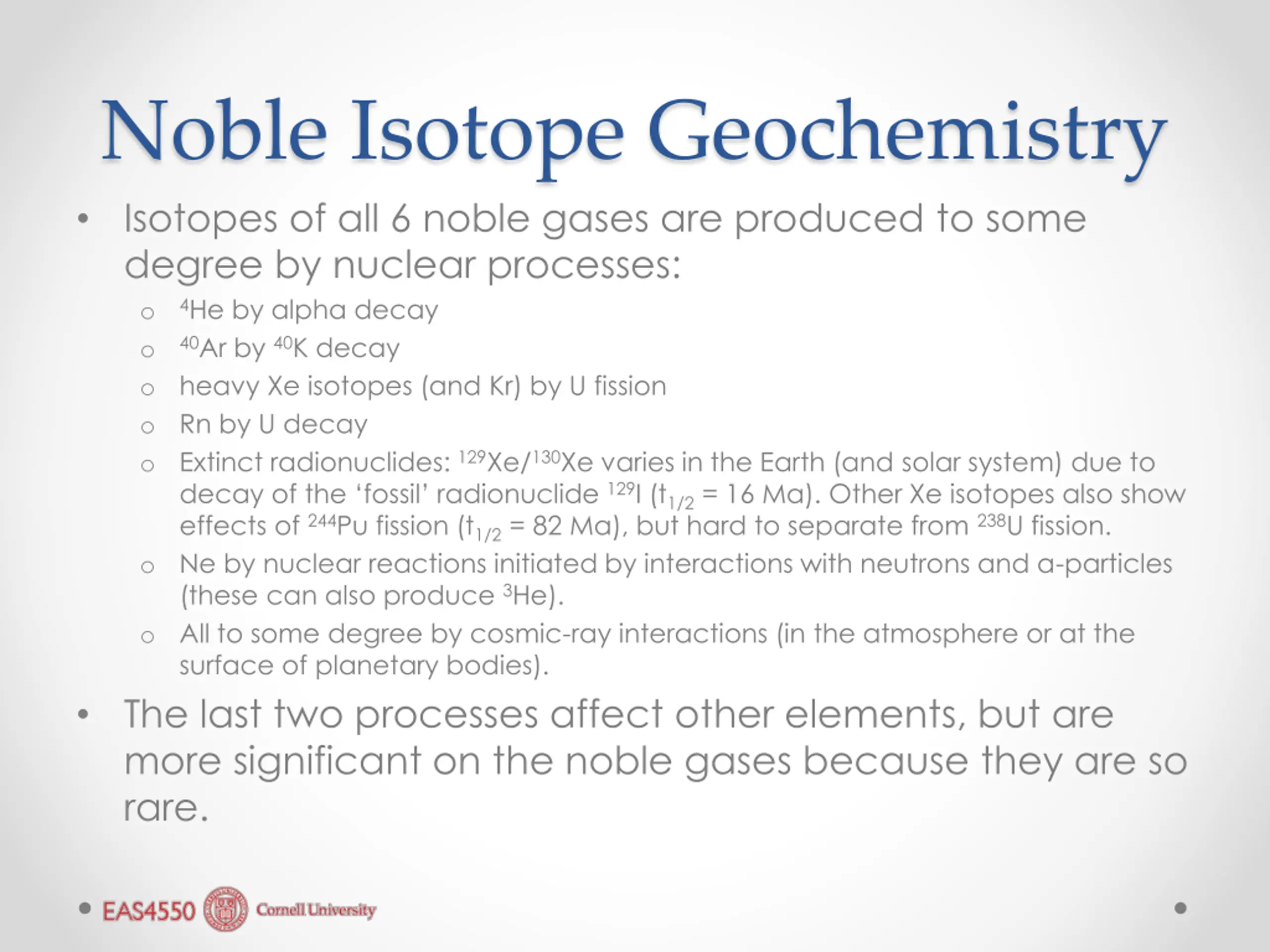 Noble Isotope Geochemistry Isotopes of all 6 noble gases are produced to some degree by nuclear processes: o o o heavy Xe isotopes (and Kr) by U fission o Rn by U decay o Extinct radionuclides: 129Xe/130Xe varies in the Earth (and solar system) due to decay of the fossil radionuclide 129I (t1/2= 16 Ma). Other Xe isotopes also show effects of 244Pu fission (t1/2= 82 Ma), but hard to separate from 238U fission. o Ne by nuclear reactions initiated by interactions with neutrons and -particles (these can also produce 3He). o All to some degree by cosmic-ray interactions (in the atmosphere or at the surface of planetary bodies). The last two processes affect other elements, but are more significant on the noble gases because they are so rare. 4He by alpha decay 40Ar by 40K decay