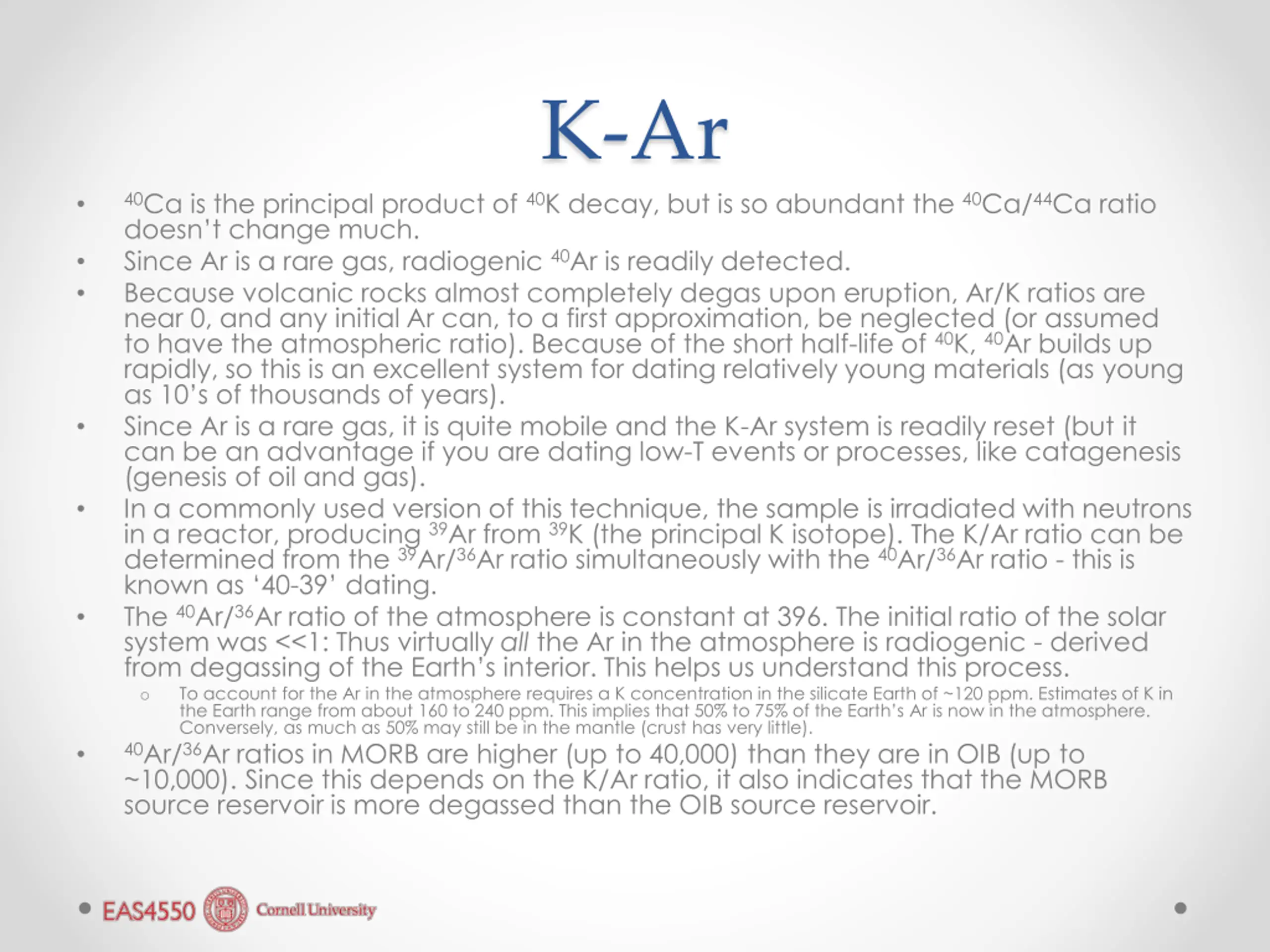 K-Ar 40Ca is the principal product of 40K decay, but is so abundant the 40Ca/44Ca ratio doesn t change much. Since Ar is a rare gas, radiogenic 40Ar is readily detected. Because volcanic rocks almost completely degas upon eruption, Ar/K ratios are near 0, and any initial Ar can, to a first approximation, be neglected (or assumed to have the atmospheric ratio). Because of the short half-life of 40K, 40Ar builds up rapidly, so this is an excellent system for dating relatively young materials (as young as 10 s of thousands of years). Since Ar is a rare gas, it is quite mobile and the K-Ar system is readily reset (but it can be an advantage if you are dating low-T events or processes, like catagenesis (genesis of oil and gas). In a commonly used version of this technique, the sample is irradiated with neutrons in a reactor, producing 39Ar from 39K (the principal K isotope). The K/Ar ratio can be determined from the 39Ar/36Ar ratio simultaneously with the 40Ar/36Ar ratio - this is known as 40-39 dating. The 40Ar/36Ar ratio of the atmosphere is constant at 396. The initial ratio of the solar system was <<1: Thus virtually all the Ar in the atmosphere is radiogenic - derived from degassing of the Earth s interior. This helps us understand this process. o To account for the Ar in the atmosphere requires a K concentration in the silicate Earth of ~120 ppm. Estimates of K in the Earth range from about 160 to 240 ppm. This implies that 50% to 75% of the Earth s Ar is now in the atmosphere. Conversely, as much as 50% may still be in the mantle (crust has very little). 40Ar/36Ar ratios in MORB are higher (up to 40,000) than they are in OIB (up to ~10,000). Since this depends on the K/Ar ratio, it also indicates that the MORB source reservoir is more degassed than the OIB source reservoir.