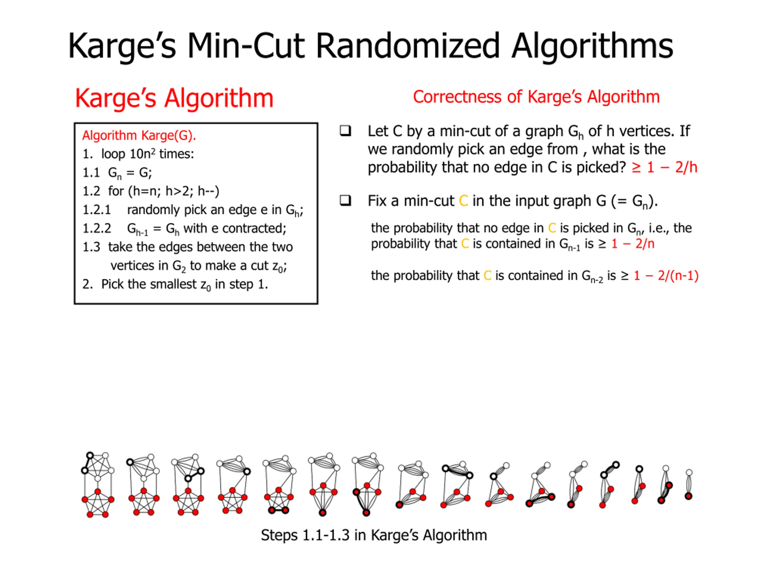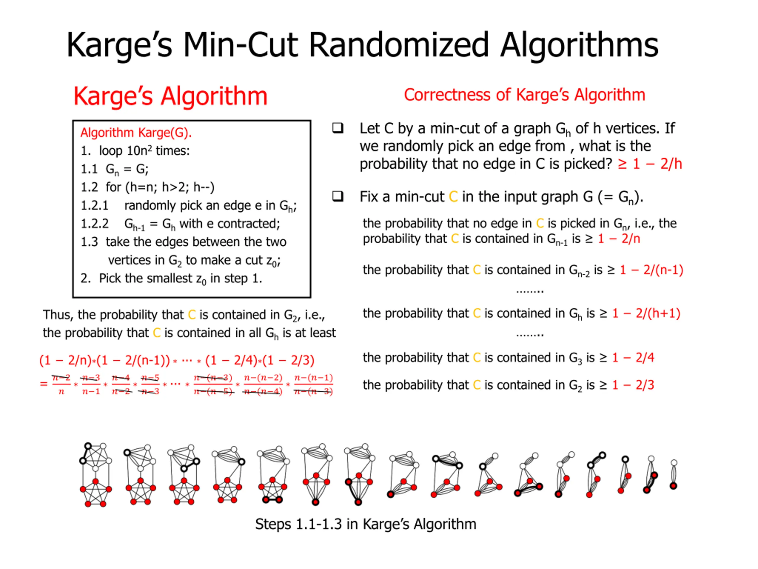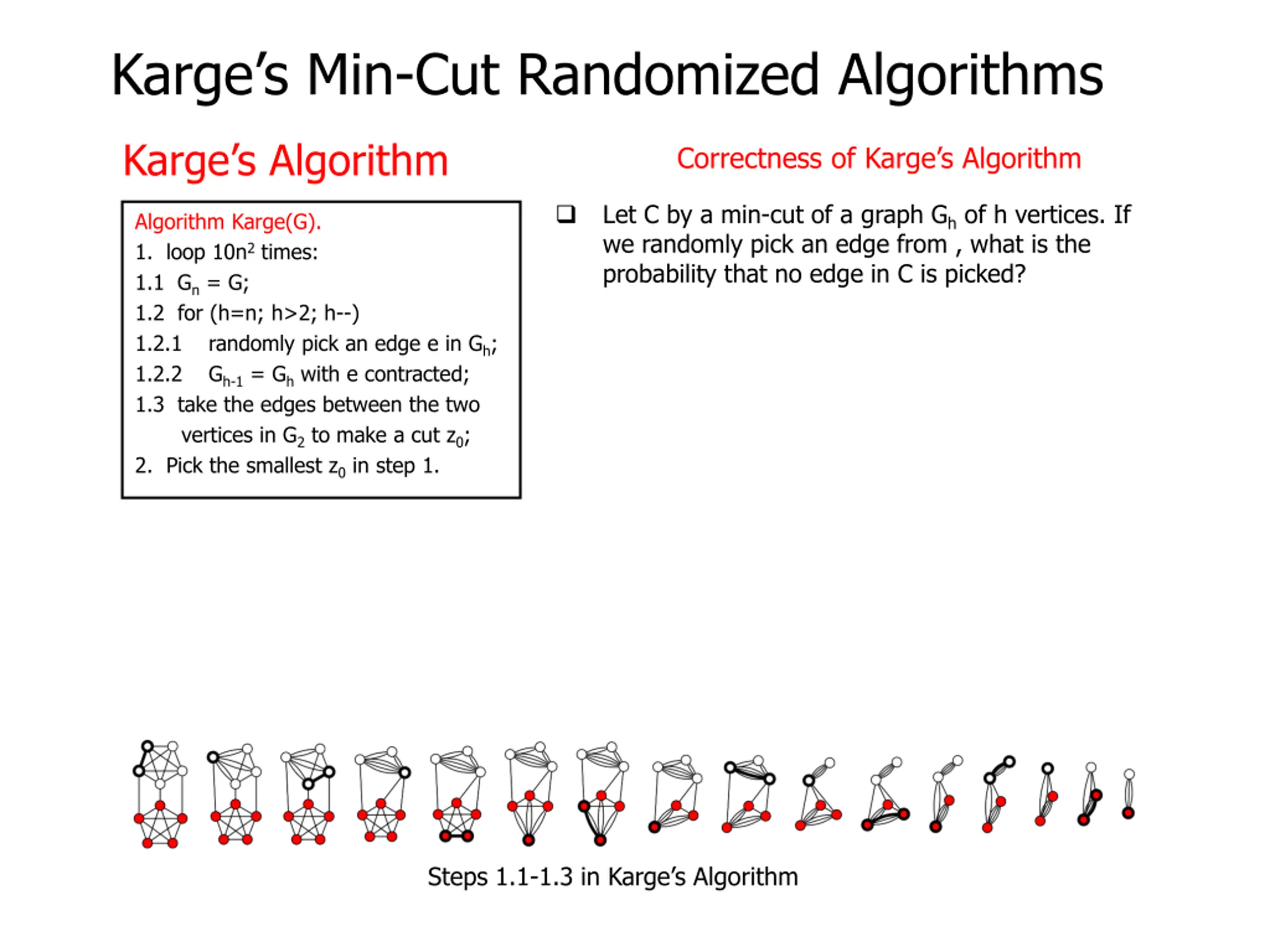 Karges Min-Cut Randomized Algorithms Karge s Algorithm Correctness of Karge s Algorithm Algorithm Karge(G). 1. loop 10n2 times: 1.1 Gn = G; 1.2 for (h=n; h>2; h--) 1.2.1 randomly pick an edge e in Gh; 1.2.2 Gh-1 = Gh with e contracted; 1.3 take the edges between the two vertices in G2 to make a cut z0; 2. Pick the smallest z0 in step 1. Steps 1.1-1.3 in Karge s Algorithm