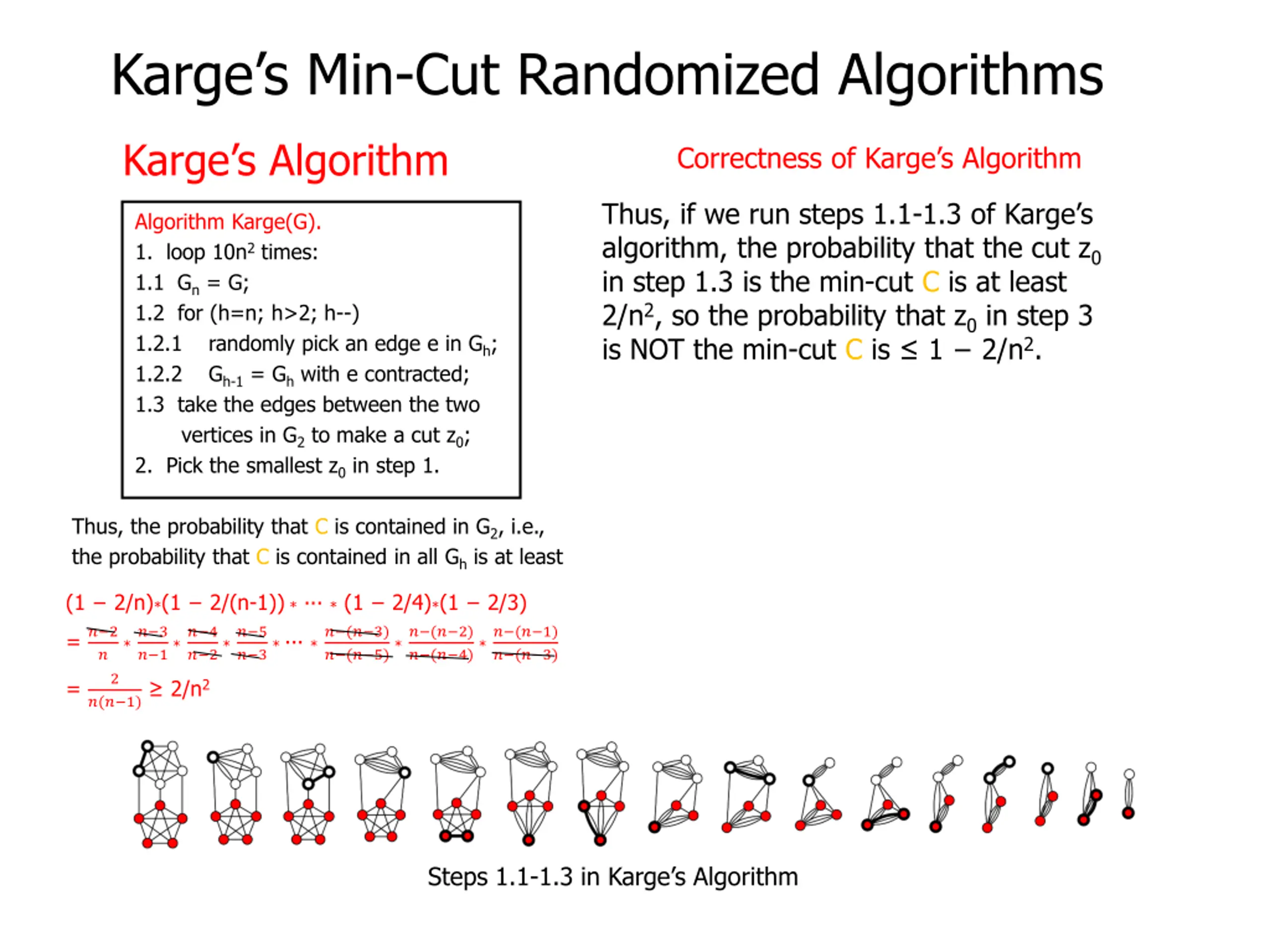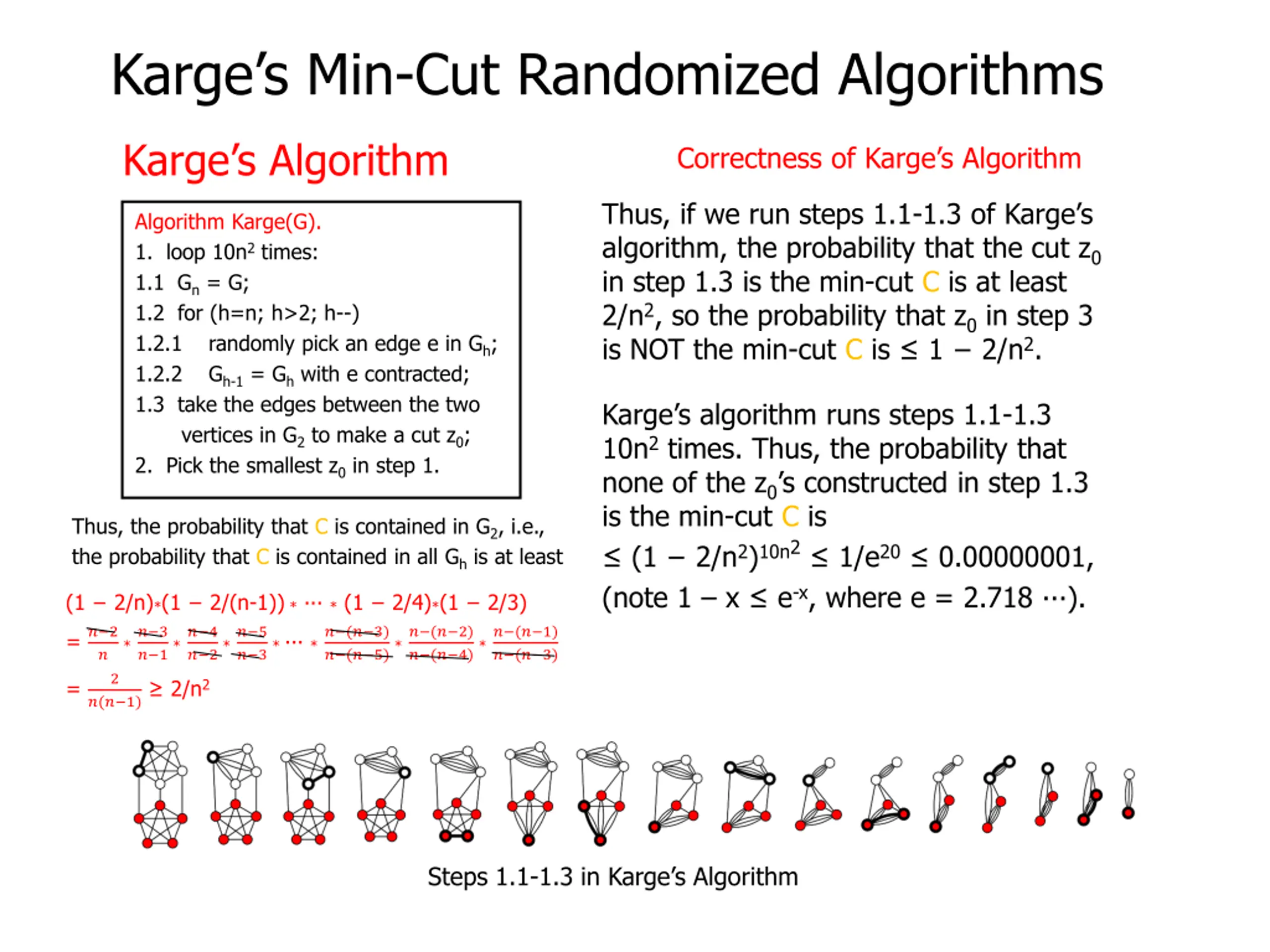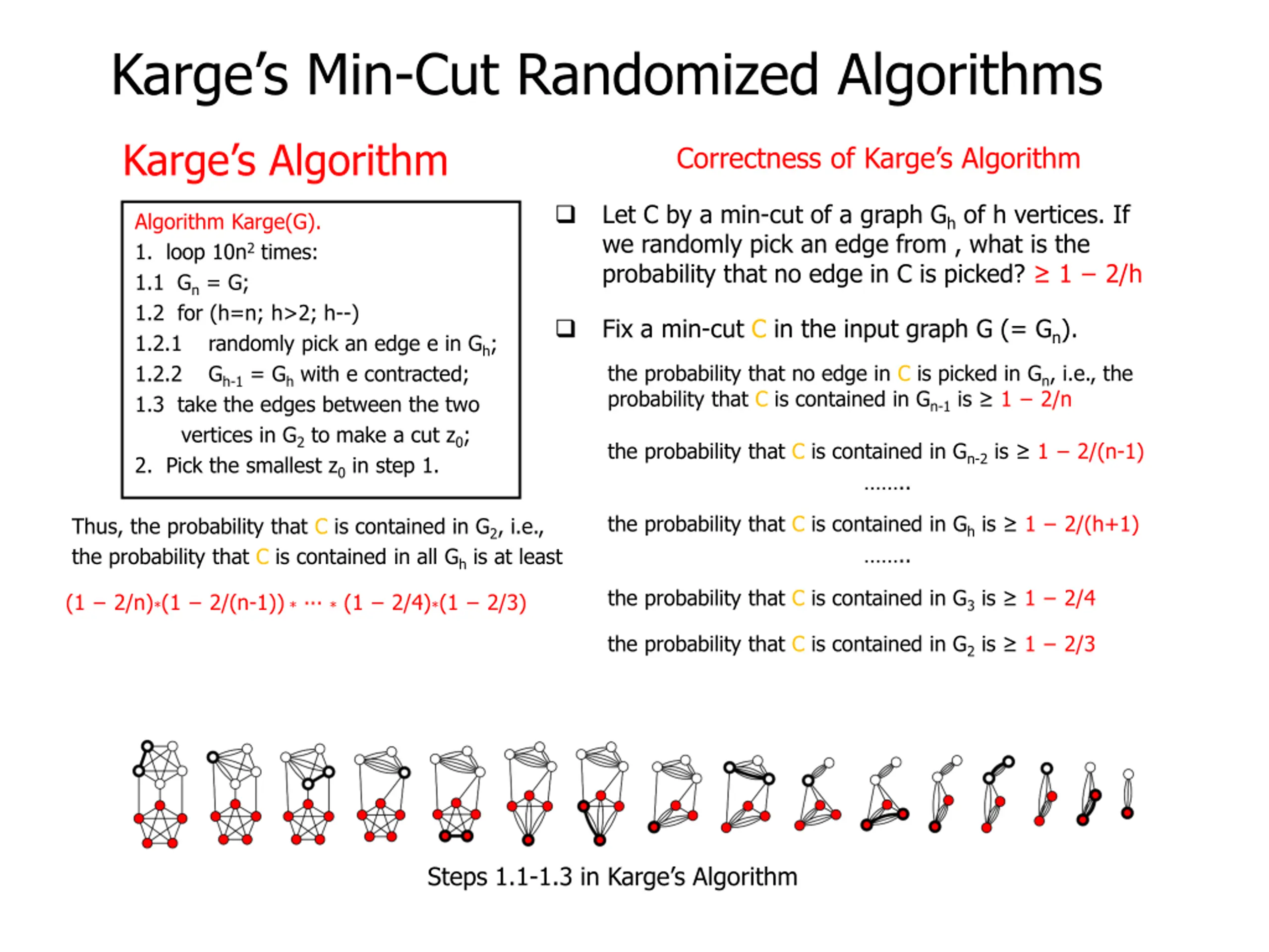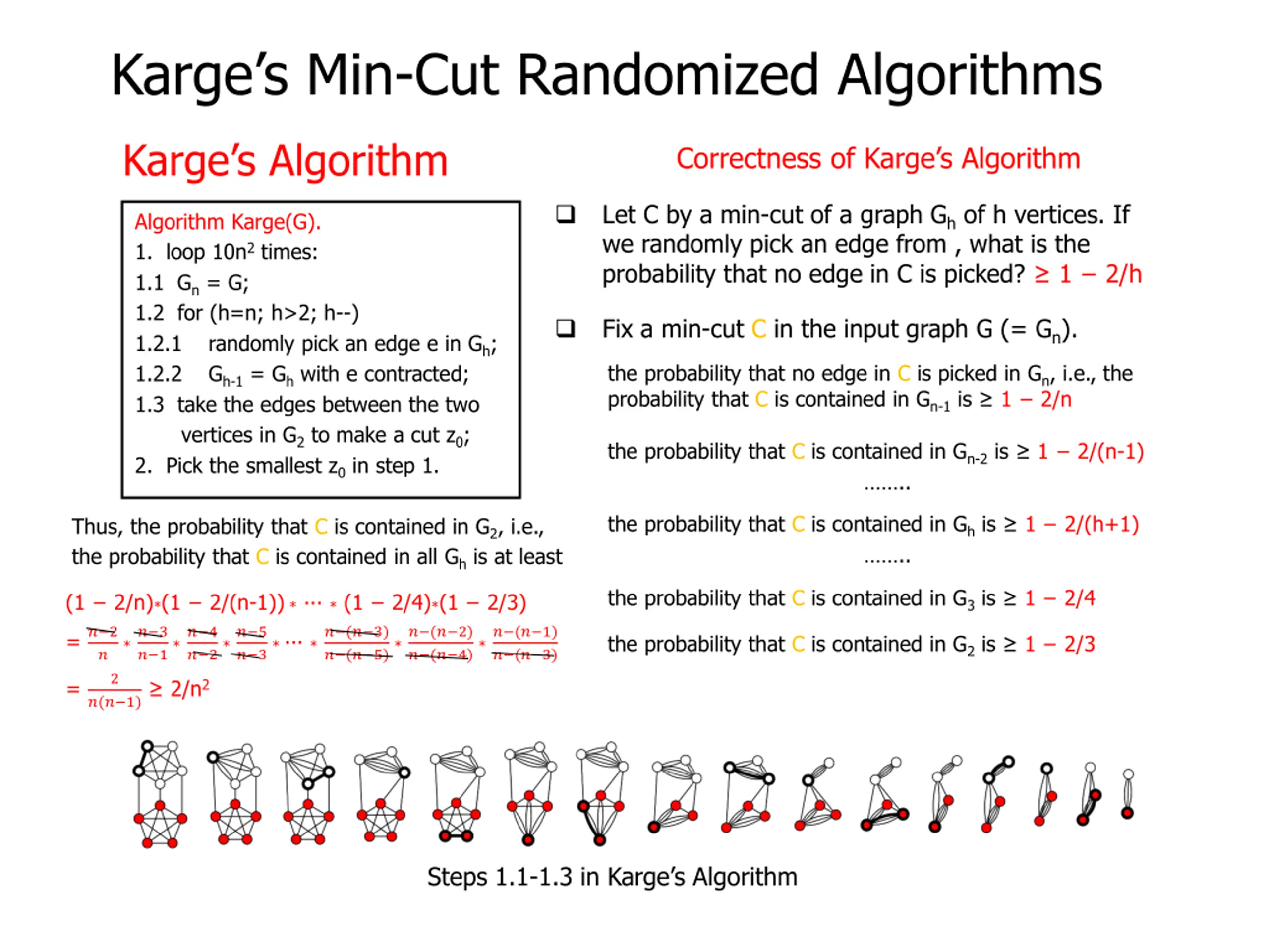 Karges Min-Cut Randomized Algorithms Karge s Algorithm Correctness of Karge s Algorithm Algorithm Karge(G). 1. loop 10n2 times: 1.1 Gn = G; 1.2 for (h=n; h>2; h--) 1.2.1 randomly pick an edge e in Gh; 1.2.2 Gh-1 = Gh with e contracted; 1.3 take the edges between the two vertices in G2 to make a cut z0; 2. Pick the smallest z0 in step 1. Steps 1.1-1.3 in Karge s Algorithm