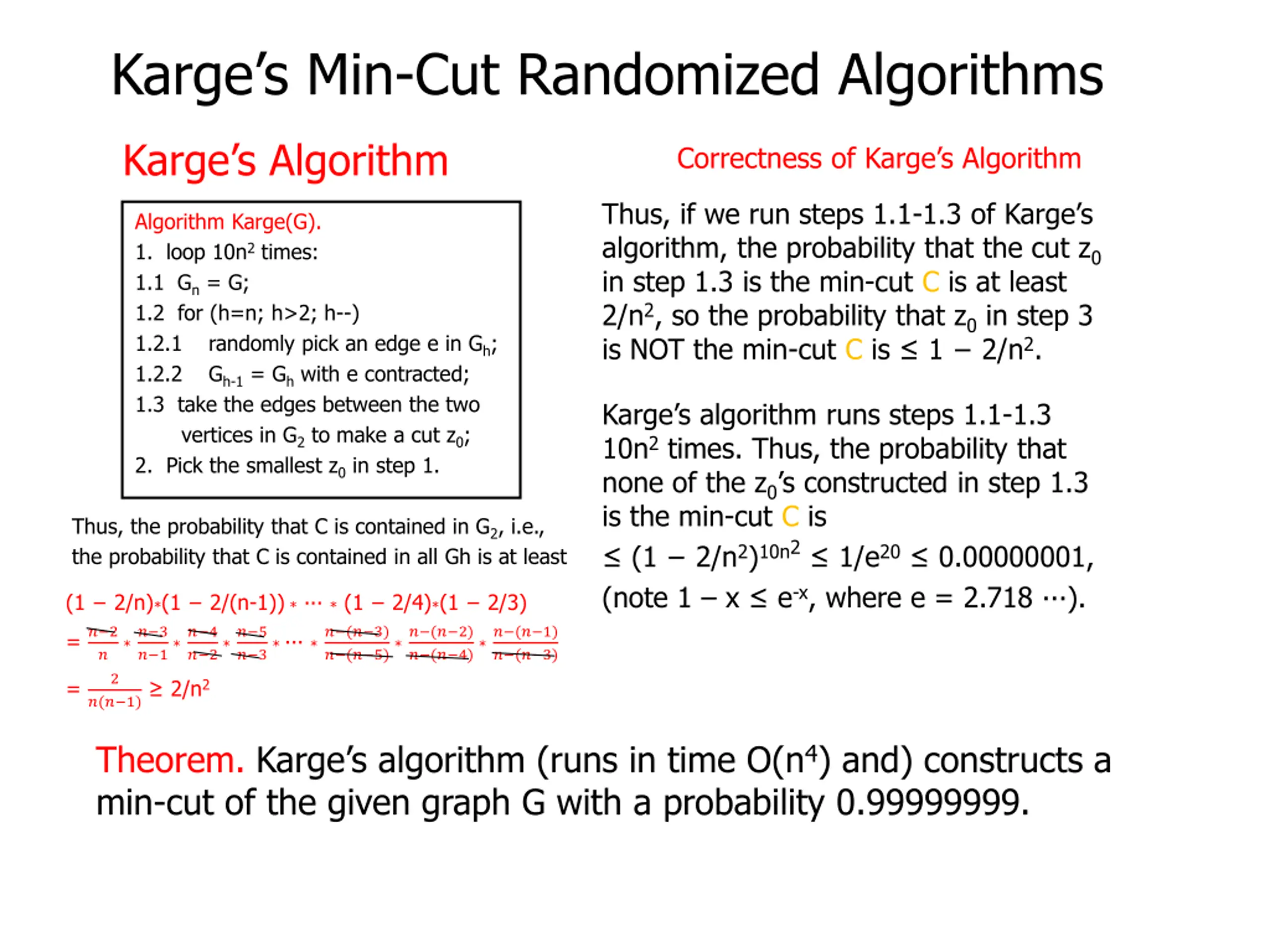 Karges Min-Cut Randomized Algorithms Karge s Algorithm Algorithm Karge(G). 1. loop 10n2 times: 1.1 Gn = G; 1.2 for (h=n; h>2; h--) 1.2.1 randomly pick an edge e in Gh; 1.2.2 Gh-1 = Gh with e contracted; 1.3 take the edges between the two vertices in G2 to make a cut z0; 2. Pick the smallest z0 in step 1.