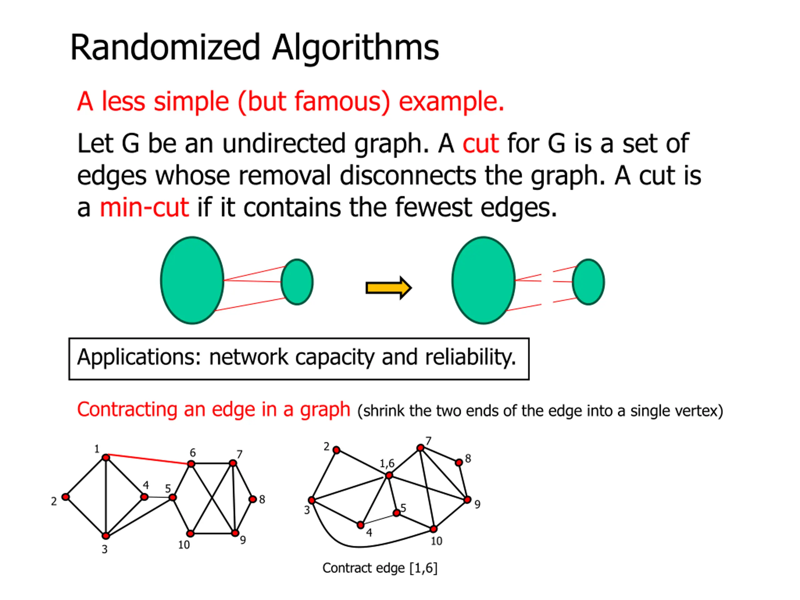 Randomized Algorithms A less simple (but famous) example. Let G be an undirected graph. A cut for G is a set of edges whose removal disconnects the graph. A cut is a min-cut if it contains the fewest edges. Applications: network capacity and reliability. Contracting an edge in a graph (shrink the two ends of the edge into a single vertex)