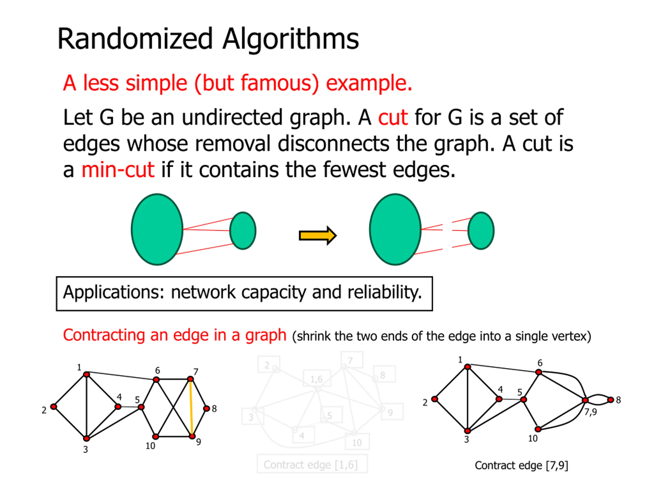 Randomized Algorithms A less simple (but famous) example. Let G be an undirected graph. A cut for G is a set of edges whose removal disconnects the graph. A cut is a min-cut if it contains the fewest edges. Applications: network capacity and reliability. Contracting an edge in a graph (shrink the two ends of the edge into a single vertex) 1 6 7 4 5 8 2 9 10 3