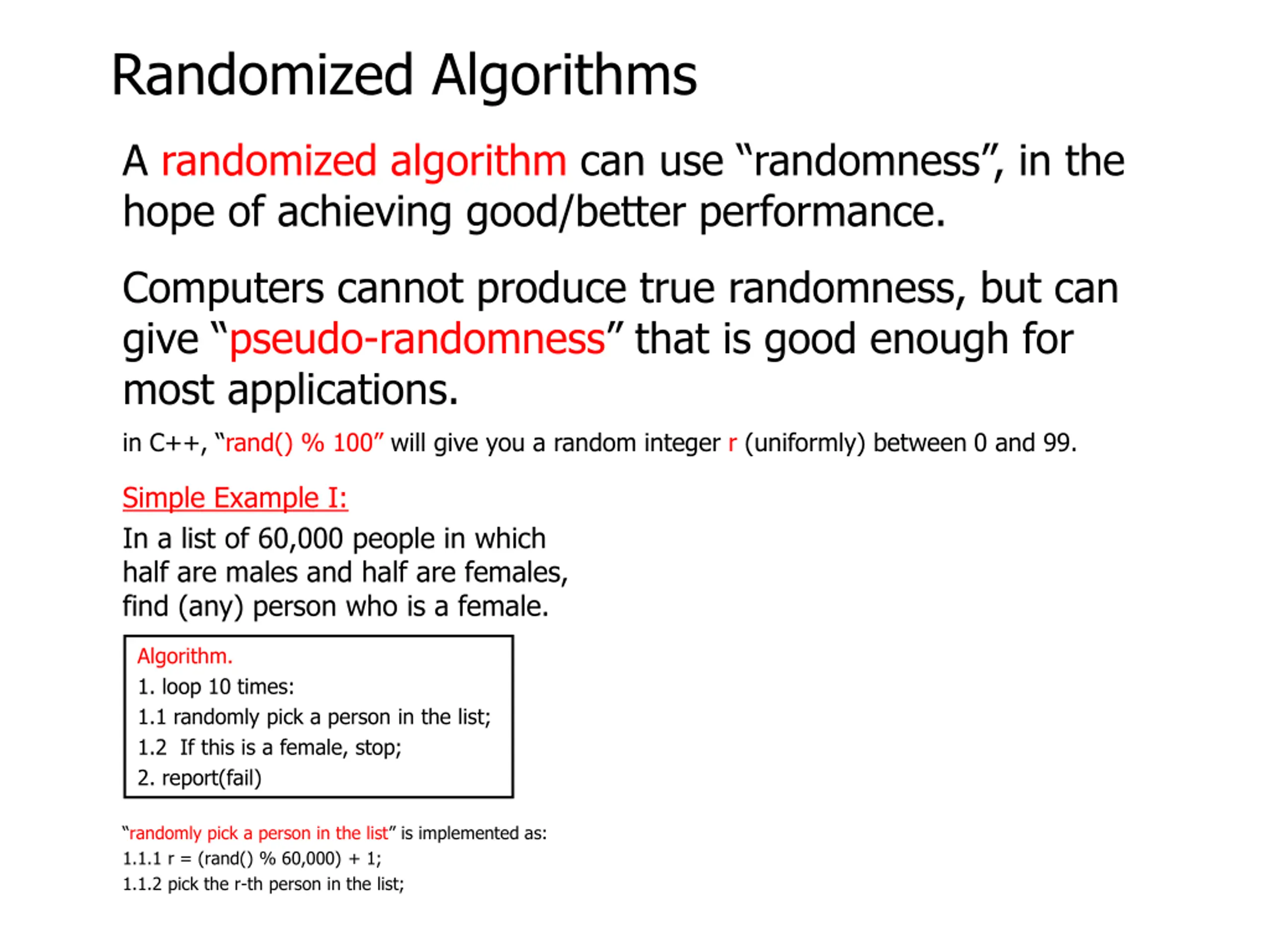 Randomized Algorithms A randomized algorithm can use randomness , in the hope of achieving good/better performance. Computers cannot produce true randomness, but can give pseudo-randomness that is good enough for most applications. in C++, rand() % 100 will give you a random integer r (uniformly) between 0 and 99. Simple Example I: In a list of 60,000 people in which half are males and half are females, find (any) person who is a female.