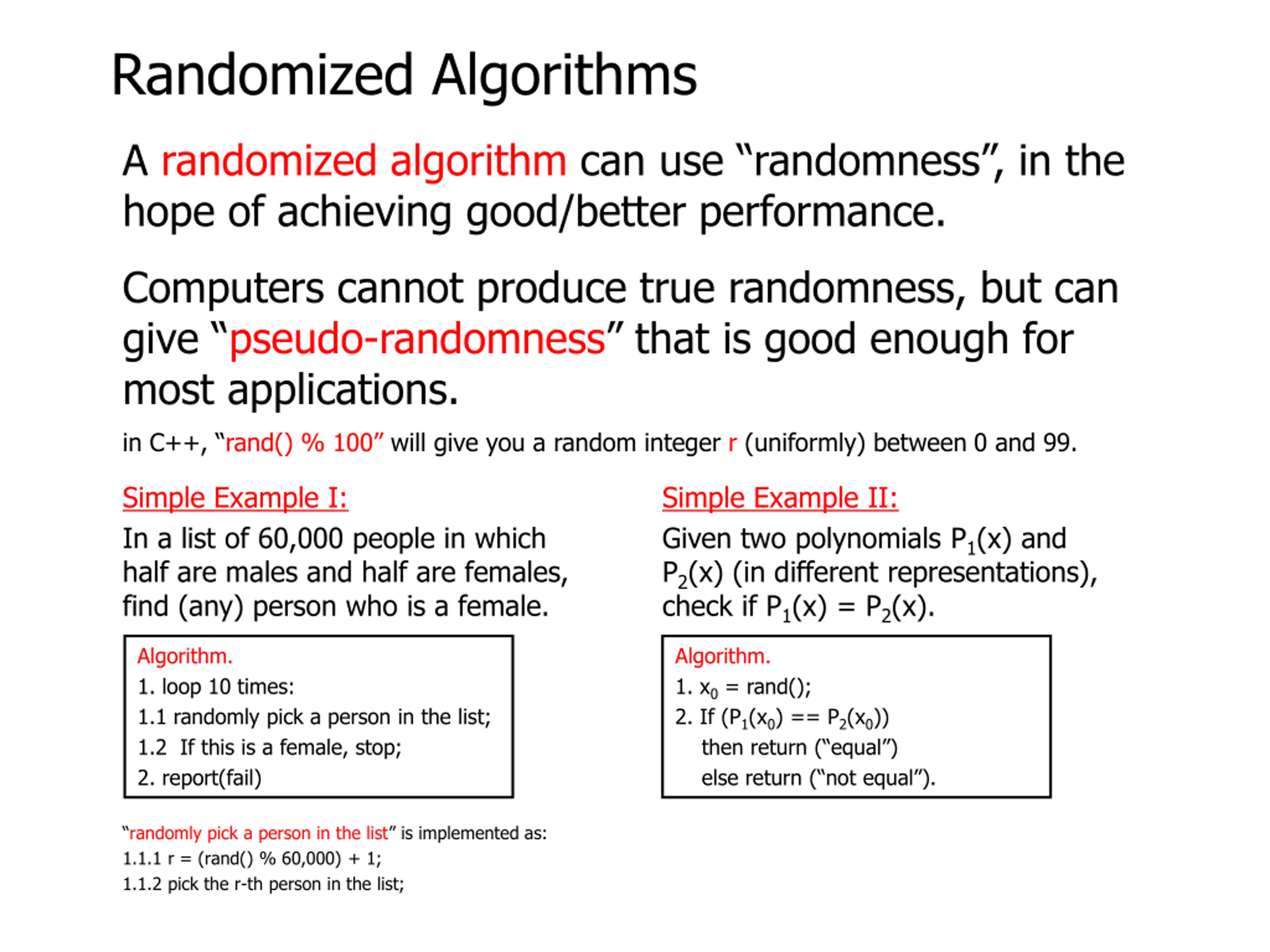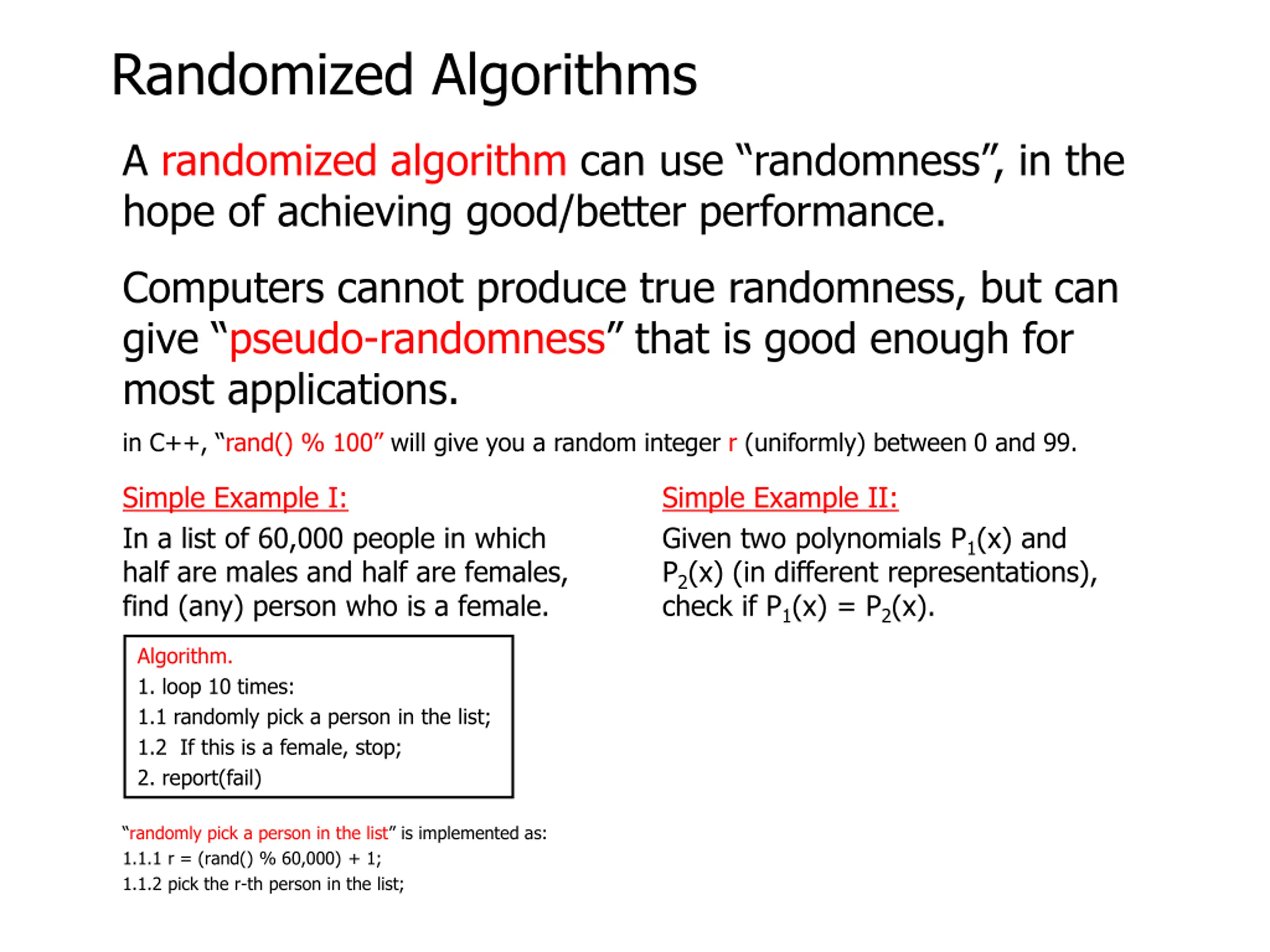 Randomized Algorithms A randomized algorithm can use randomness , in the hope of achieving good/better performance. Computers cannot produce true randomness, but can give pseudo-randomness that is good enough for most applications. in C++, rand() % 100 will give you a random integer r (uniformly) between 0 and 99. Simple Example I: In a list of 60,000 people in which half are males and half are females, find (any) person who is a female. Simple Example II: Given two polynomials P1(x) and P2(x) (in different representations), check if P1(x) = P2(x). Algorithm. 1. loop 10 times: 1.1 randomly pick a person in the list; 1.2 If this is a female, stop; 2. report(fail) randomly pick a person in the list is implemented as: 1.1.1 r = (rand() % 60,000) + 1; 1.1.2 pick the r-th person in the list;