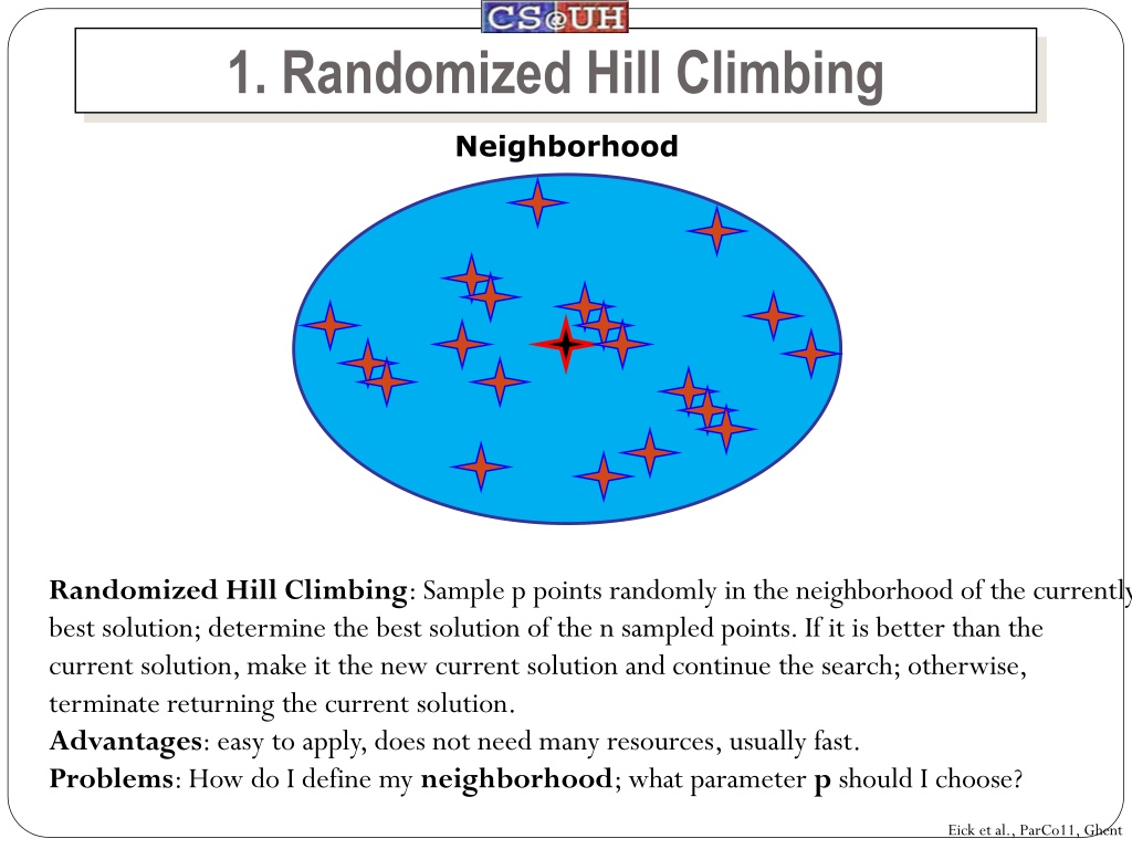 1. Randomized Hill Climbing Neighborhood Randomized Hill Climbing: Sample p points randomly in the neighborhood of the currently best solution; determine the best solution of the n sampled points. If it is better than the current solution, make it the new current solution and continue the search; otherwise, terminate returning the current solution. Advantages: easy to apply, does not need many resources, usually fast. Problems: How do I define my neighborhood; what parameter p should I choose? Eick et al., ParCo11, Ghent