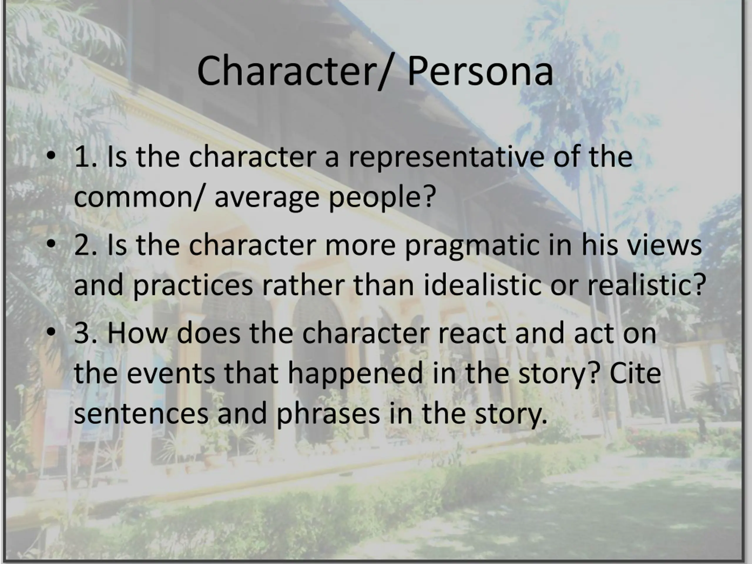 Character/ Persona 1. Is the character a representative of the common/ average people? 2. Is the character more pragmatic in his views and practices rather than idealistic or realistic? 3. How does the character react and act on the events that happened in the story? Cite sentences and phrases in the story.