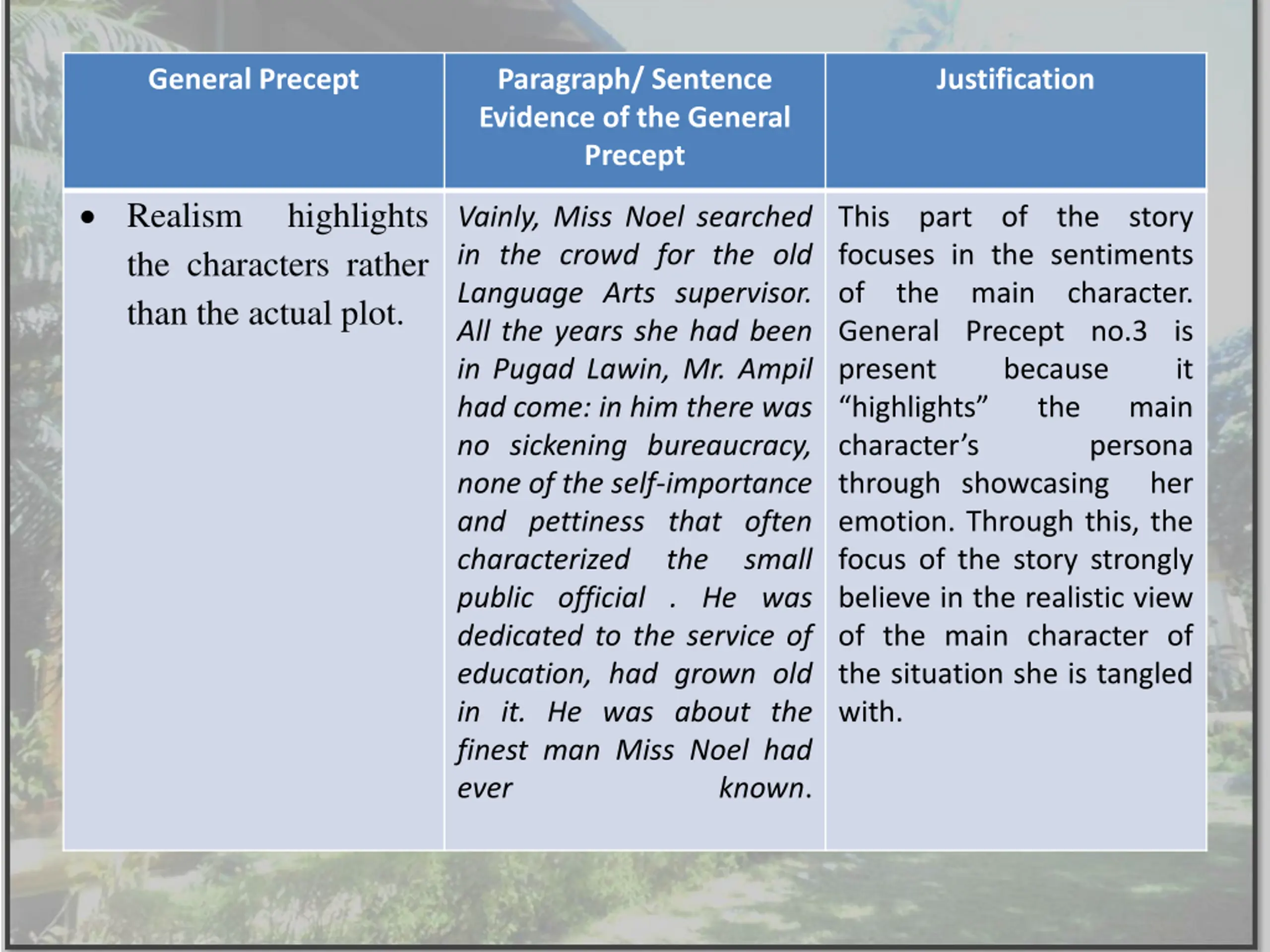 General Precept Paragraph/ Sentence Evidence of the General Precept Justification Realism the characters rather than the actual plot. highlights Vainly, Miss Noel searched in the crowd for the old Language Arts supervisor. All the years she had been in Pugad Lawin, Mr. Ampil had come: in him there was no sickening bureaucracy, none of the self-importance and pettiness that often characterized public official . He was dedicated to the service of education, had grown old in it. He was about the finest man Miss Noel had ever This part of the story focuses in the sentiments of the main character. General Precept no.3 is present because highlights character s through showcasing her emotion. Through this, the focus of the story strongly believe in the realistic view of the main character of the situation she is tangled with. it the main persona the small known.