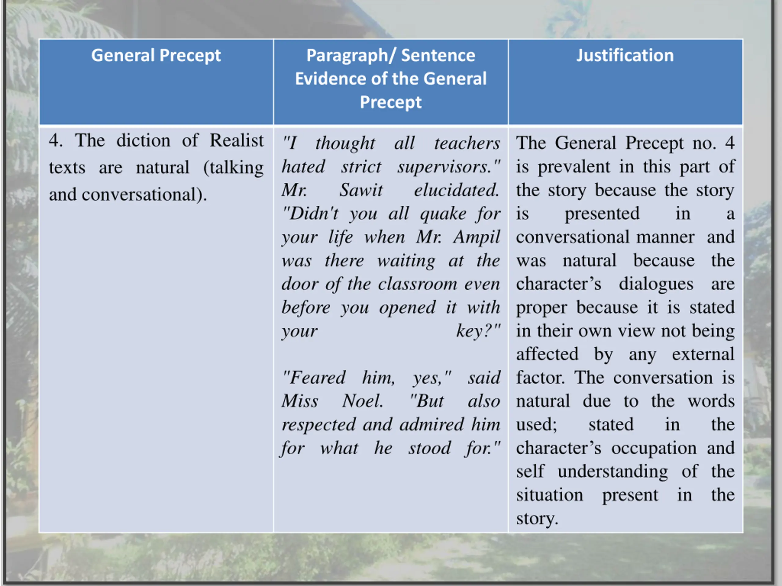 General Precept Paragraph/ Sentence Evidence of the General Precept Justification 4. The diction of Realist texts are natural (talking and conversational). The General Precept no. 4 is prevalent in this part of the story because the story is presented conversational manner and was natural because the character s dialogues are proper because it is stated in their own view not being affected by any external factor. The conversation is natural due to the words used; stated character s occupation and self understanding of the situation present in the story. "I thought all teachers hated strict supervisors." Mr. Sawit "Didn't you all quake for your life when Mr. Ampil was there waiting at the door of the classroom even before you opened it with your elucidated. in a key?" "Feared him, yes," said Miss Noel. respected and admired him for what he stood for." "But also in the