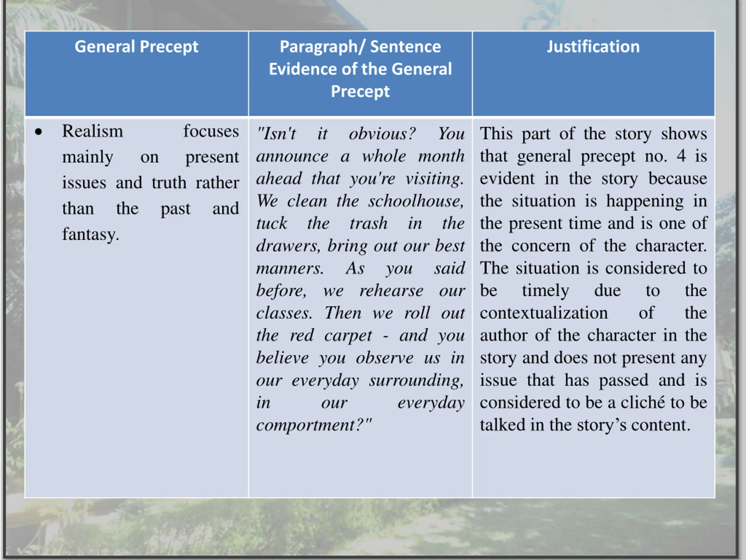 General Precept Paragraph/ Sentence Evidence of the General Precept Justification Realism mainly issues and truth rather than the fantasy. focuses present This part of the story shows that general precept no. 4 is evident in the story because the situation is happening in the present time and is one of the concern of the character. The situation is considered to be timely due contextualization author of the character in the story and does not present any issue that has passed and is considered to be a clich to be talked in the story s content. "Isn't it obvious? You announce a whole month ahead that you're visiting. We clean the schoolhouse, tuck the trash in the drawers, bring out our best manners. As you said before, we rehearse our classes. Then we roll out the red carpet - and you believe you observe us in our everyday surrounding, in our comportment?" on past and to of the the everyday