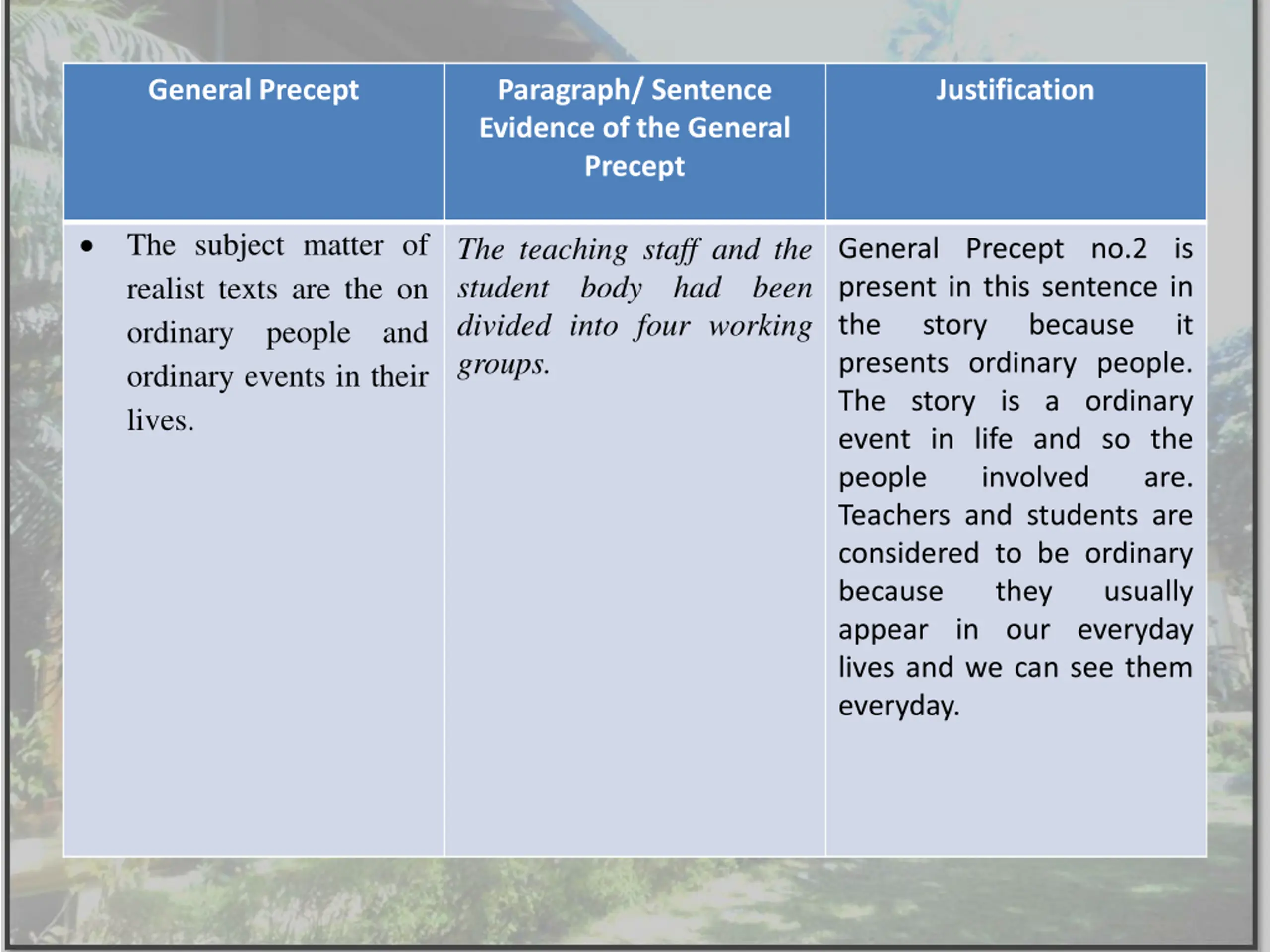 General Precept Paragraph/ Sentence Evidence of the General Precept Justification The subject matter of realist texts are the on ordinary people and ordinary events in their lives. The teaching staff and the student body had been divided into four working groups. General Precept no.2 is present in this sentence in the story presents ordinary people. The story is a ordinary event in life and so the people involved Teachers and students are considered to be ordinary because they appear in our everyday lives and we can see them everyday. because it are. usually