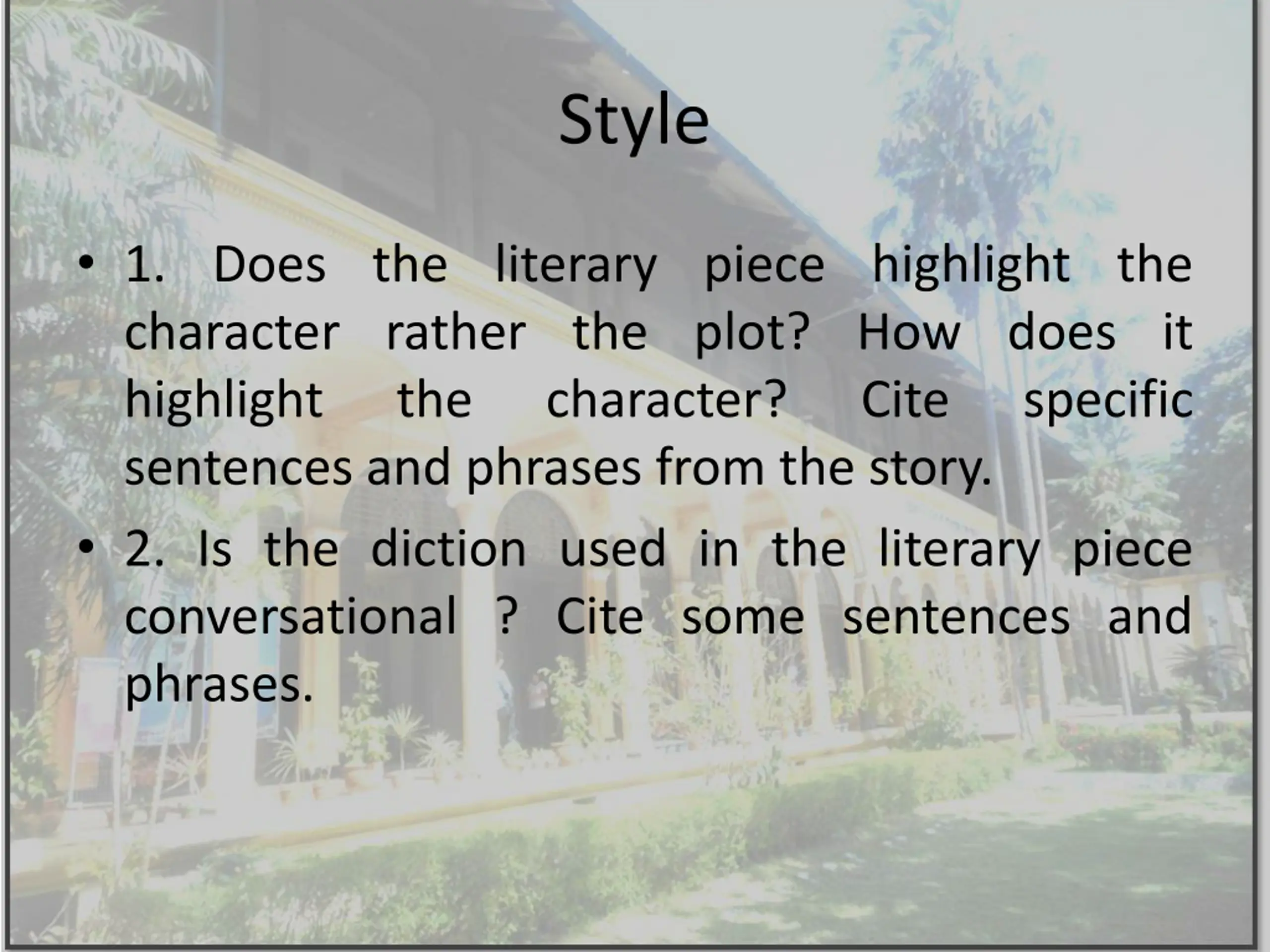 Style 1. Does the literary piece highlight the character rather the plot? How does it highlight the character? sentences and phrases from the story. 2. Is the diction used in the literary piece conversational ? Cite some sentences and phrases. Cite specific