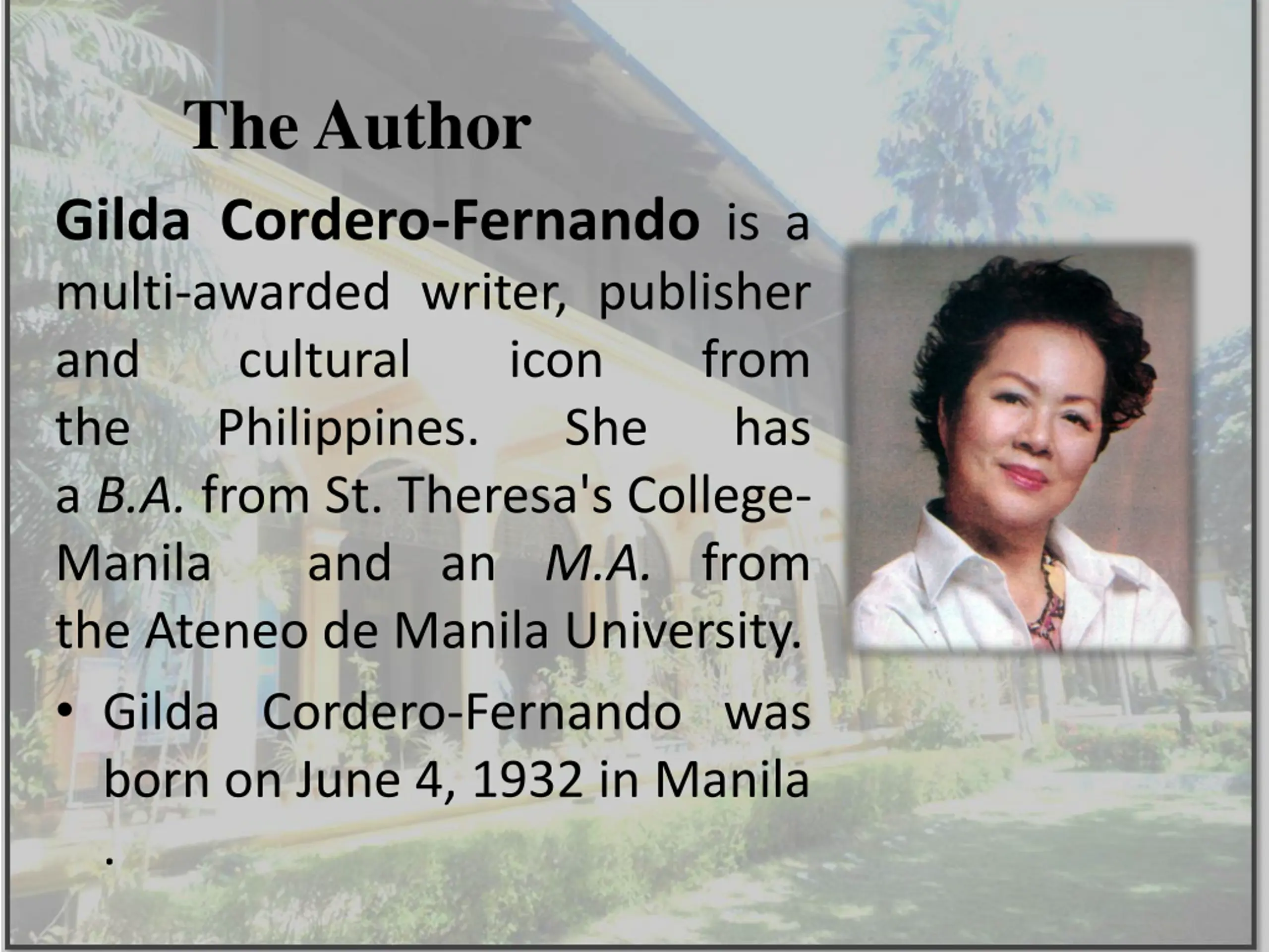 The Author Gilda Cordero-Fernando is a multi-awarded writer, publisher and cultural the Philippines. a B.A. from St. Theresa's College- Manila and an M.A. from the Ateneo de Manila University. Gilda Cordero-Fernando was born on June 4, 1932 in Manila . icon from has She
