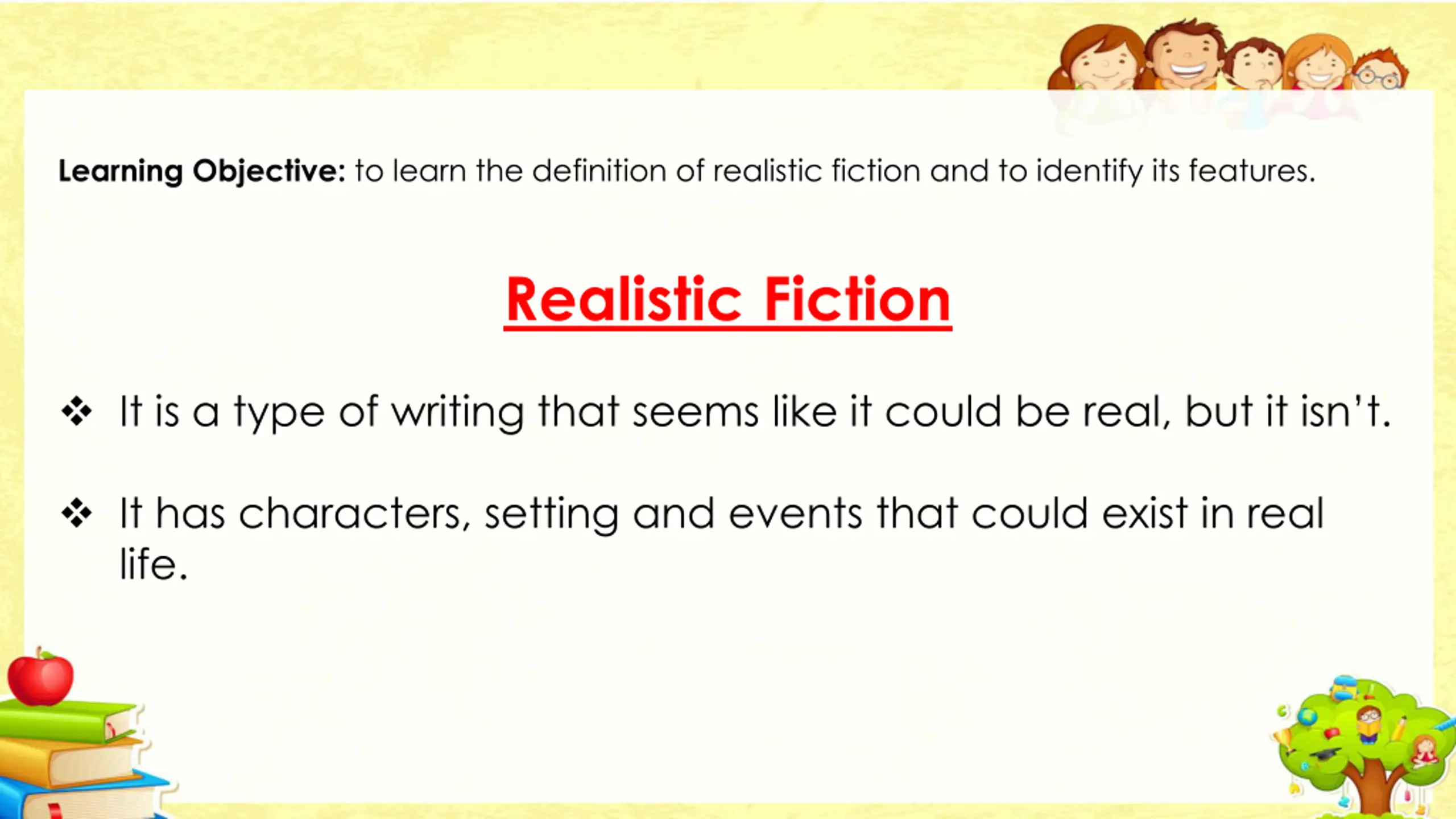 Learning Objective: to learn the definition of realistic fiction and to identify its features. Realistic Fiction It is a type of writing that seems like it could be real, but it isn t. It has characters, setting and events that could exist in real life.