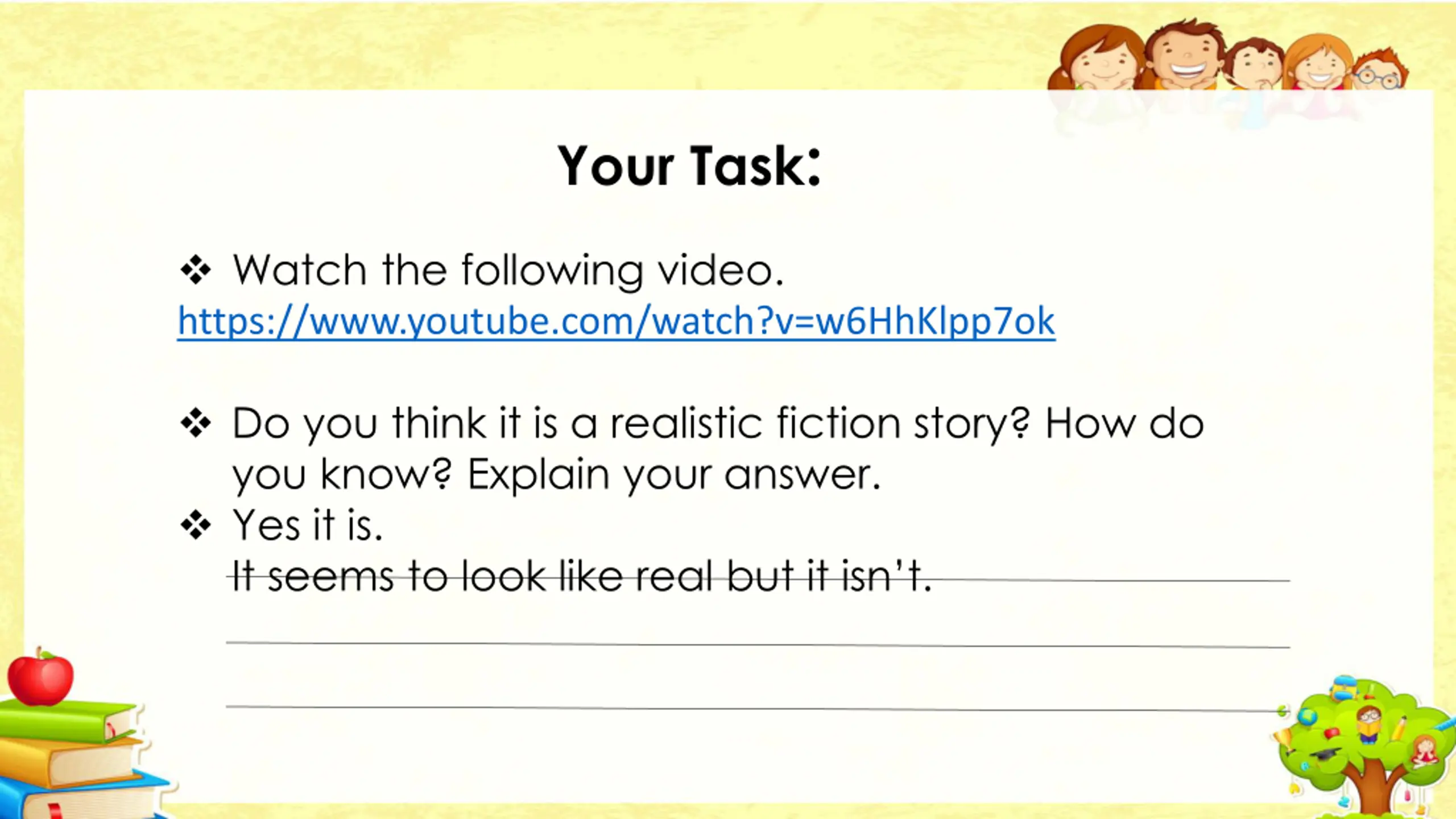 Your Task: Watch the following video. https://www.youtube.com/watch?v=w6HhKlpp7ok Do you think it is a realistic fiction story? How do you know? Explain your answer. Yes it is. It seems to look like real but it isn t.