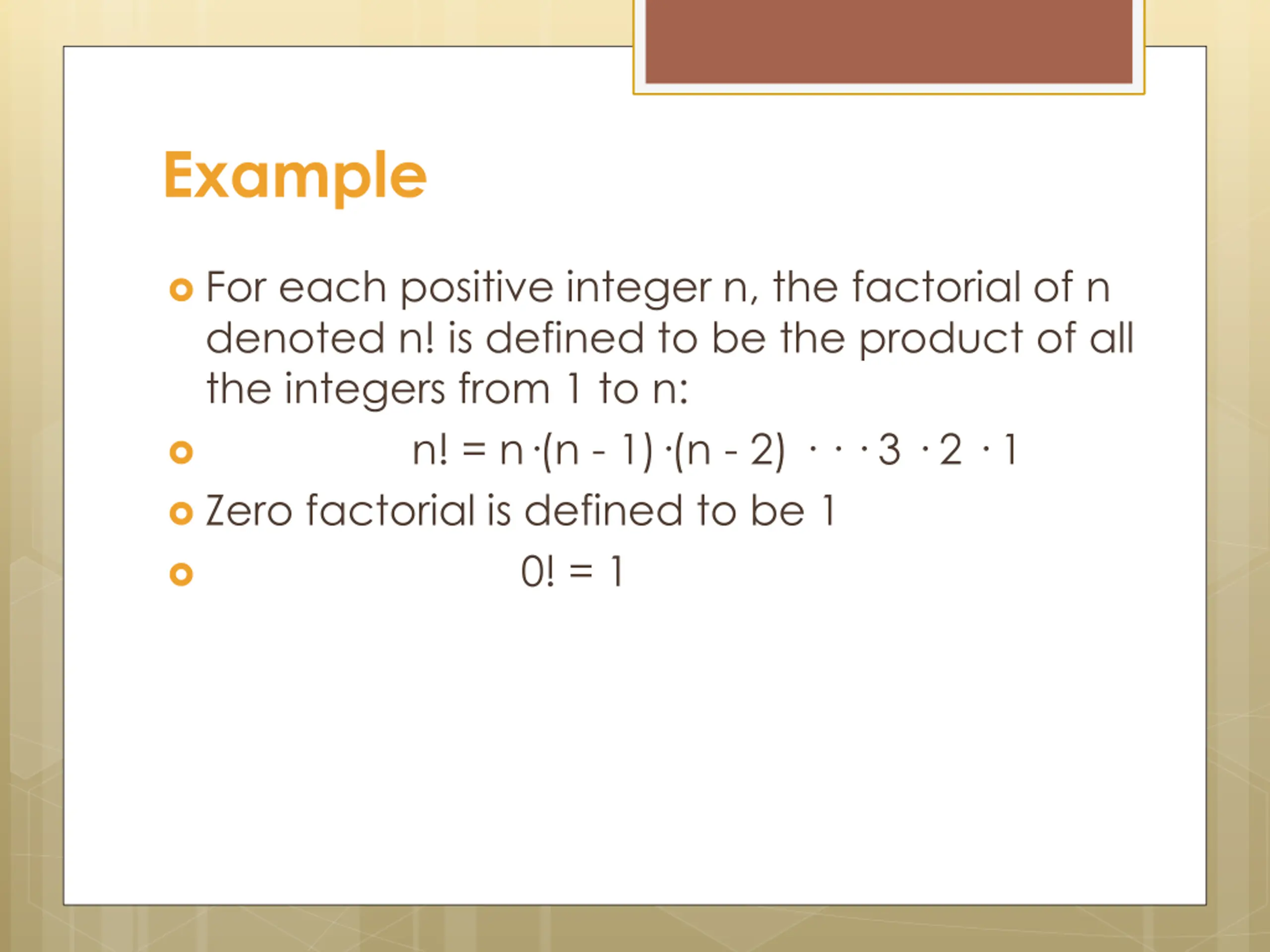 Example For each positive integer n, the factorial of n denoted n! is defined to be the product of all the integers from 1 to n: n! = n (n - 1) (n - 2) 3 2 1 Zero factorial is defined to be 1 0! = 1