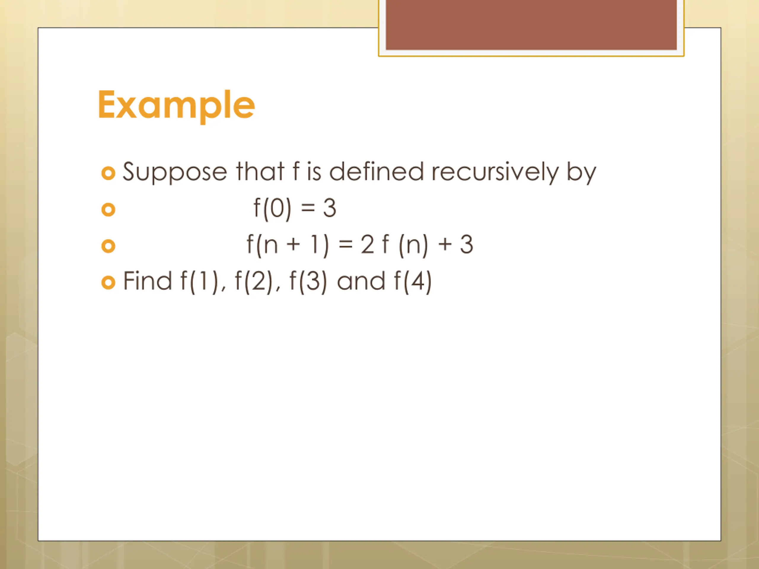 Example Suppose that f is defined recursively by f(0) = 3 f(n + 1) = 2 f (n) + 3 Find f(1), f(2), f(3) and f(4)