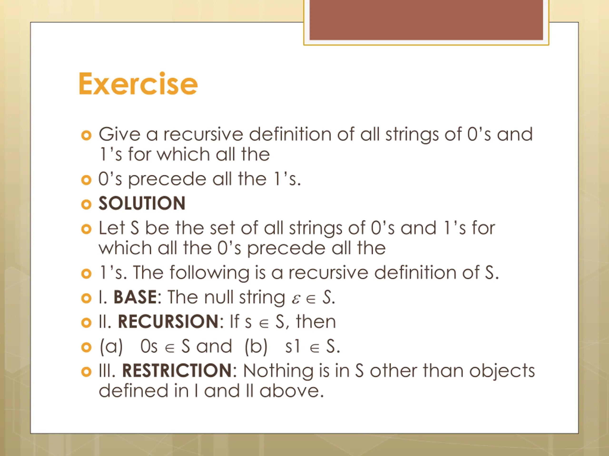 Exercise Give a recursive definition of all strings of 0 s and 1 s for which all the 0 s precede all the 1 s. SOLUTION Let S be the set of all strings of 0 s and 1 s for which all the 0 s precede all the 1 s. The following is a recursive definition of S. I. BASE: The null string S. II. RECURSION: If s S, then (a) 0s S and (b) s1 S. III. RESTRICTION: Nothing is in S other than objects defined in I and II above.