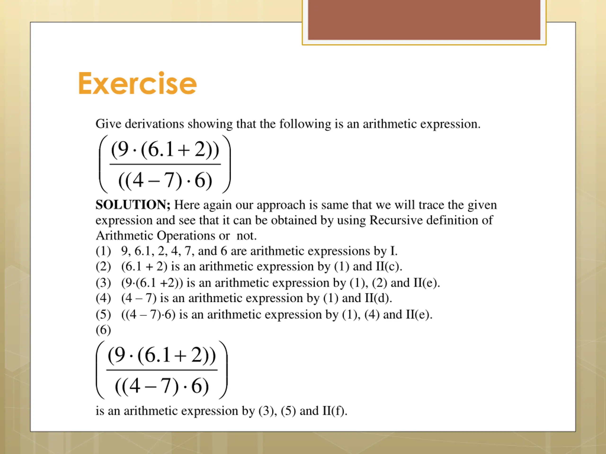 Exercise Give derivations showing that the following is an arithmetic expression. ) 6 ) 7 4 (( SOLUTION; Here again our approach is same that we will trace the given expression and see that it can be obtained by using Recursive definition of Arithmetic Operations or not. (1) 9, 6.1, 2, 4, 7, and 6 are arithmetic expressions by I. (2) (6.1 + 2) is an arithmetic expression by (1) and II(c). (3) (9 (6.1 +2)) is an arithmetic expression by (1), (2) and II(e). (4) (4 7) is an arithmetic expression by (1) and II(d). (5) ((4 7) 6) is an arithmetic expression by (1), (4) and II(e). (6) ) 6 ) 7 4 (( is an arithmetic expression by (3), (5) and II(f). + 9 ( 1 . 6 ( 2 )) + 9 ( 1 . 6 ( 2 ))