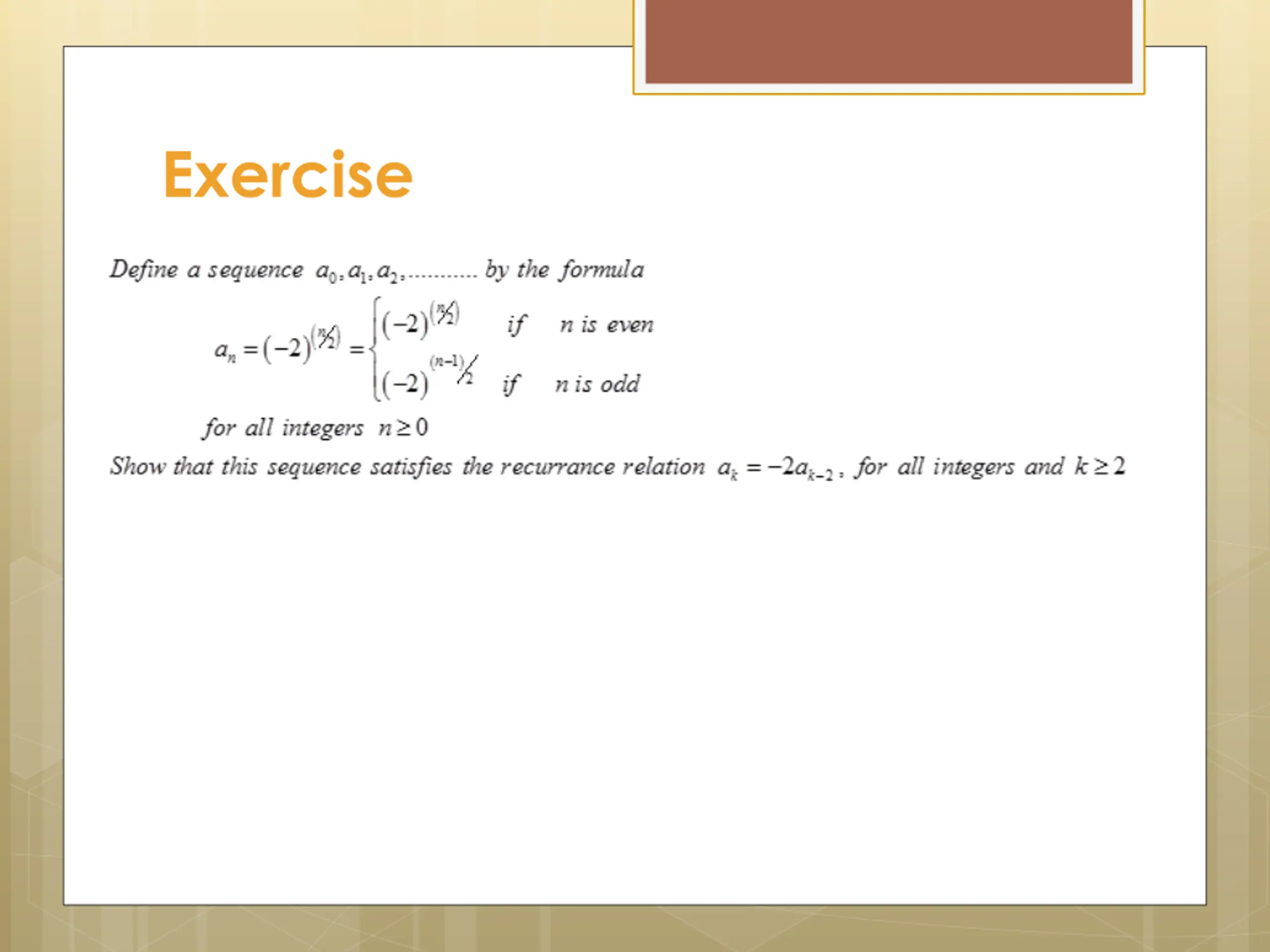 Exercise Define a sequence b0, b1, b2, . . . by the formula bn = 5n, for all integers n 0. Show that this sequence satisfies the recurrence relation bk= 5bk 1, for all integers k 1. SOLUTION: The sequence is given by the formula bn = 5n Substituting k for n we get bk= 5k . . . . . (1)